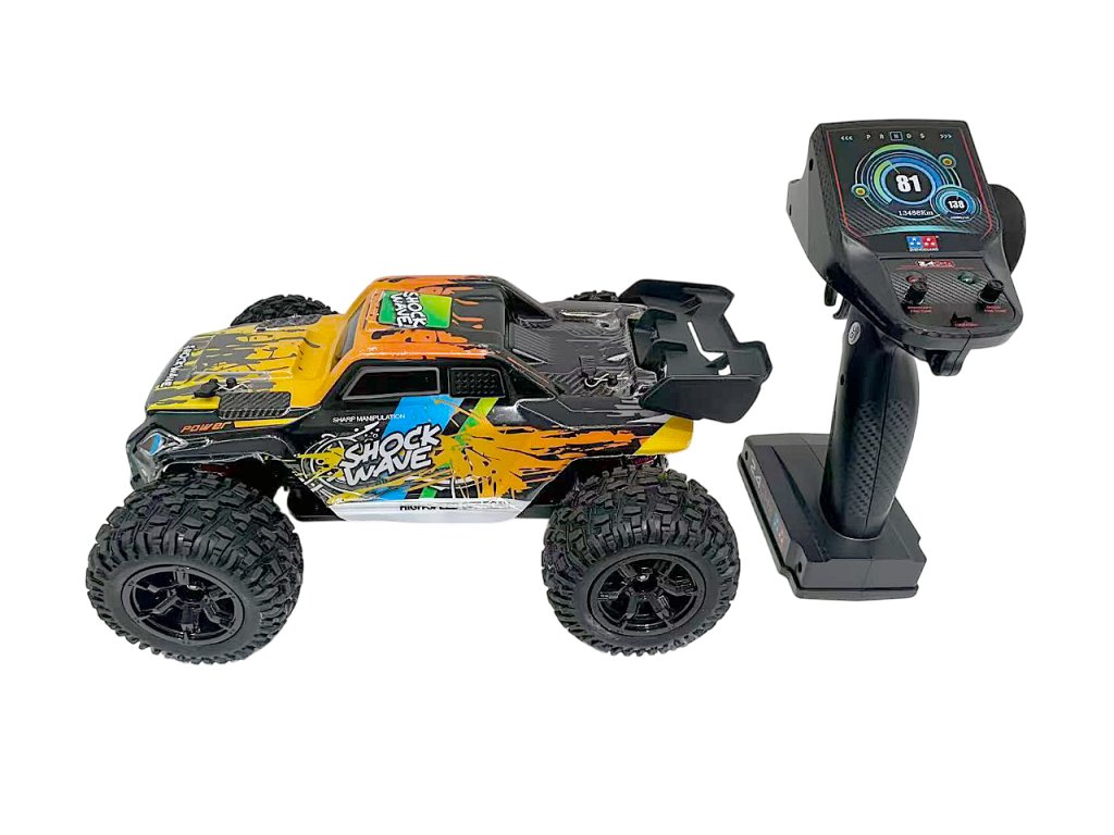 Изживейте екстремно представяне с RC чудовищен камион в мащаб 1:16. Този модел е оборудван с мощен безчетков двигател, който може да достигне скорост над 60 км/ч, и задвижване на четирите колела за максимално сцепление и стабилност.