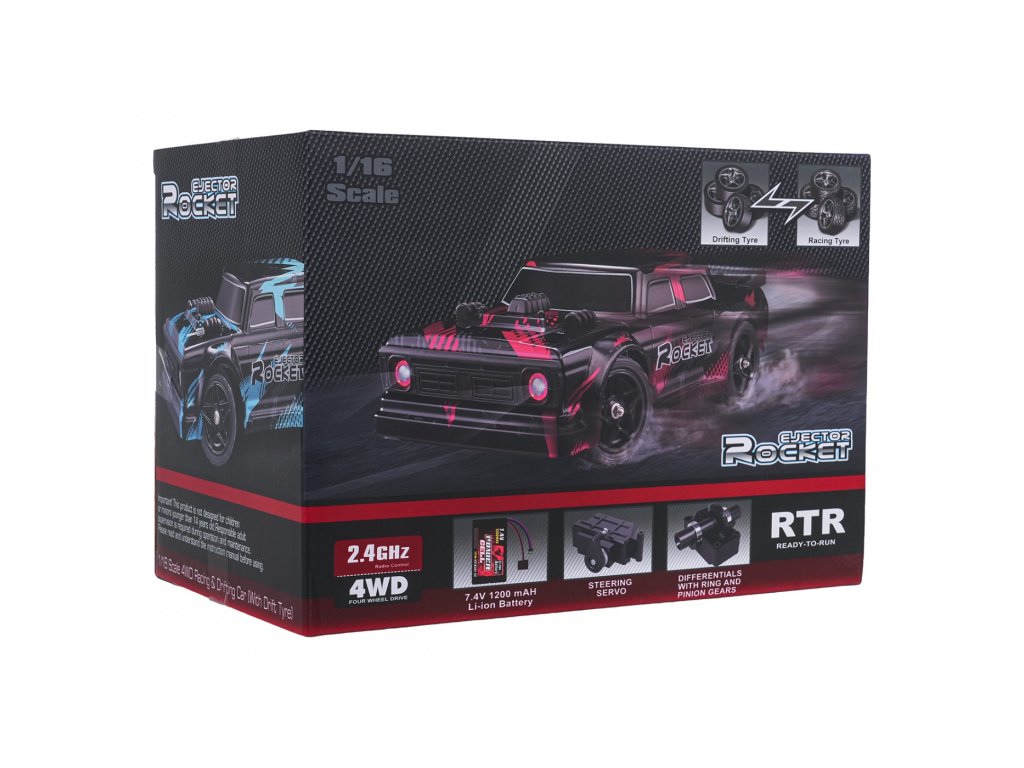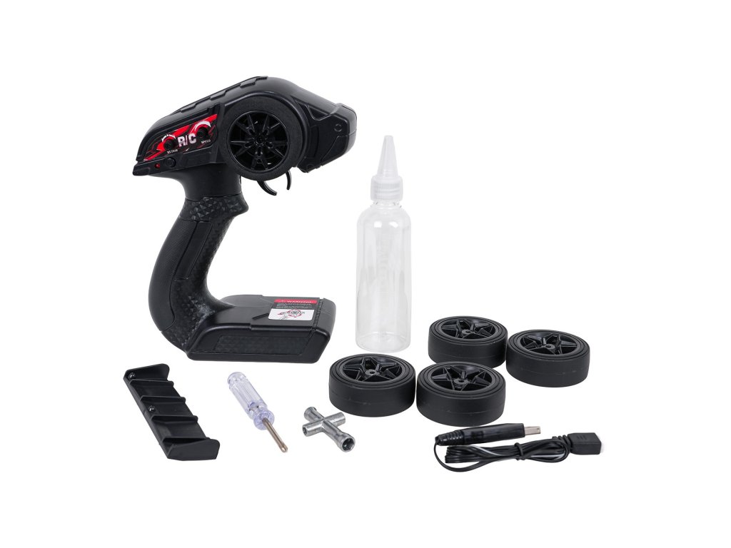 Дистанционно управляем дрифт автомобил в мащаб 1:16 за деца над 14 години. Каросерията на автомобила е изработена от здрава пластмаса, за да издържи и най-дивия дрифт. Гладките колела позволяват на автомобила без усилие да навлиза в остри завои с контролирано приплъзване. Пакетът включва също 4 резервни гуми с грайфер за стандартни състезания. Автомобилът се движи във всички посоки: напред, назад, завива наляво и надясно и дрифтира. Моделът се захранва от 7,4V батерия (включена в комплекта), дистанционното управление от 3 батерии тип 3 x AA 1,5V (не са включени в комплекта).