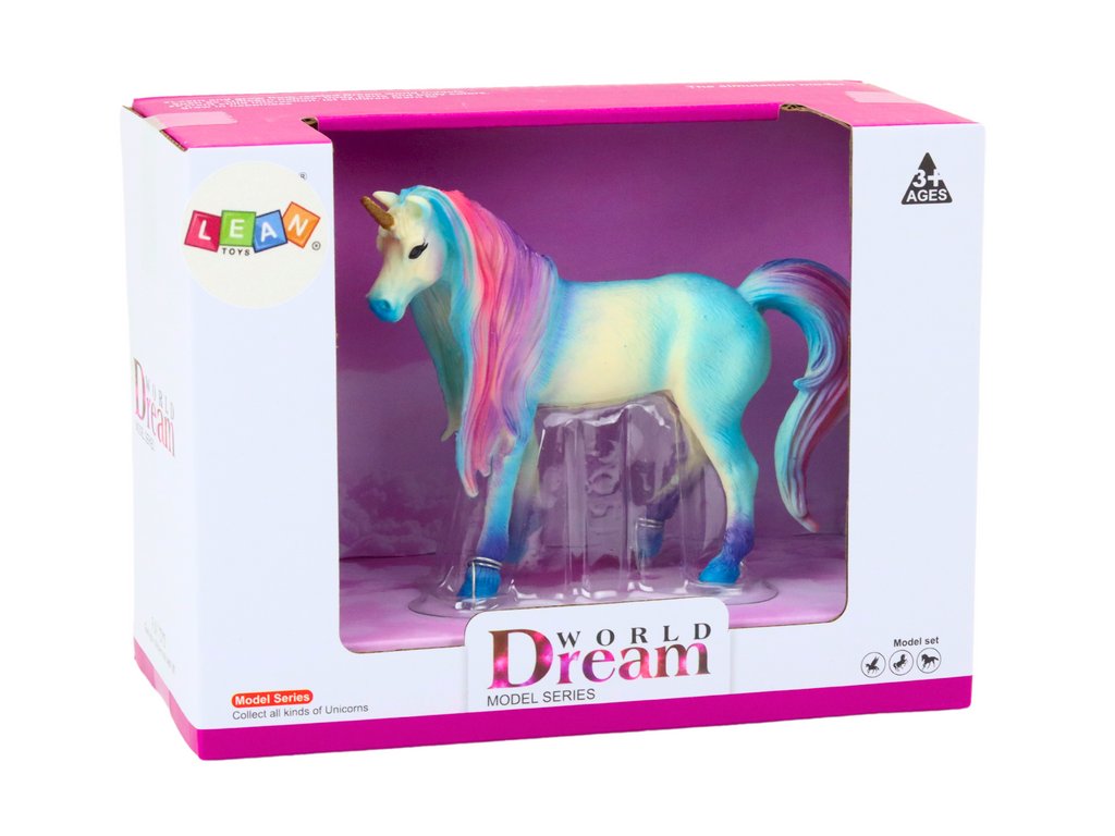Гривата и опашката на еднорога са цветни, добавяйки на фигурката приказен чар и правейки я атрактивна с ярките си цветове. Цветните елементи красиво контрастират със синята основа, създавайки хармоничен и естетически завършен образ.