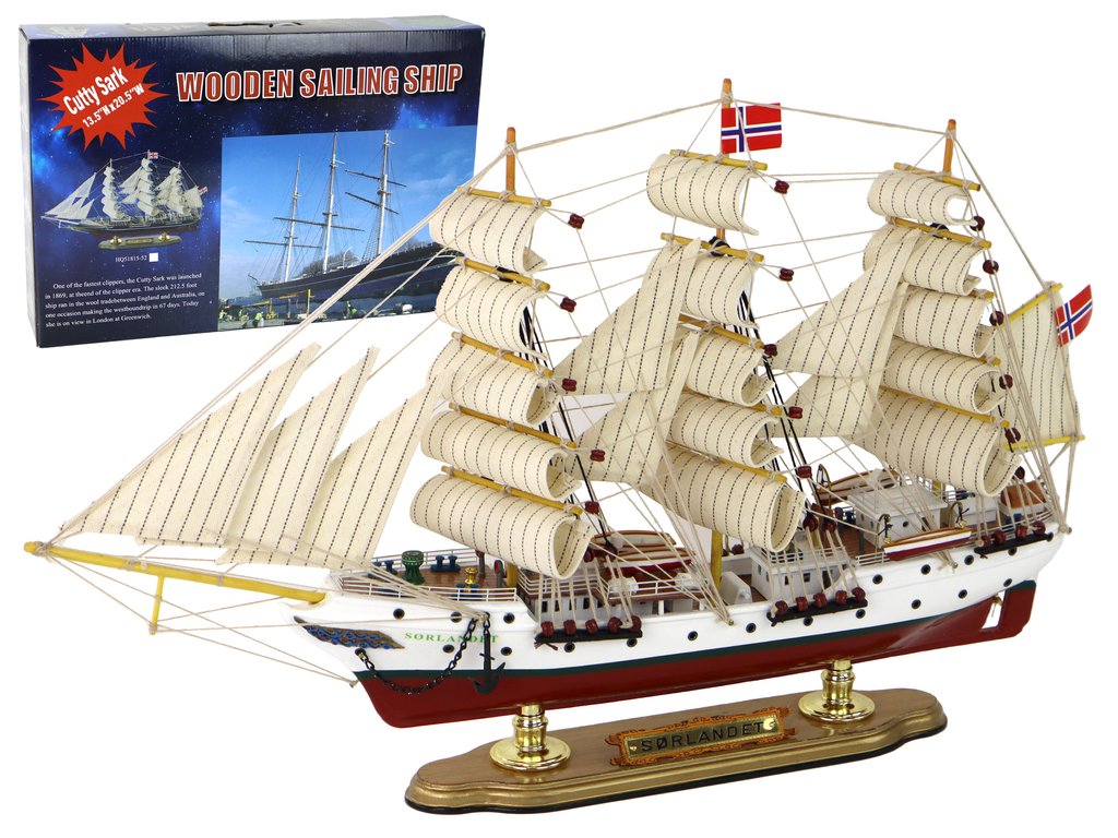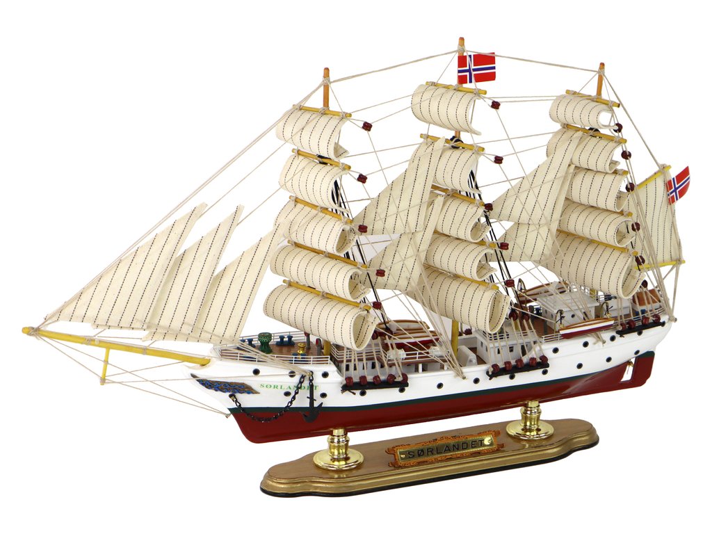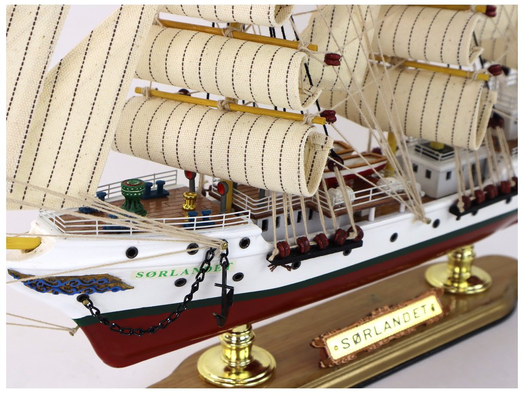 Този модел е колекционерска ветроходна яхта "Сорландет". Името ѝ е поставено на дървена поставка, която придава автентичност и позволява идентифициране на конкретната яхта. На върха на платната е издигнато норвежко знаме, което подчертава произхода на лодката и връзката ѝ с тази страна.