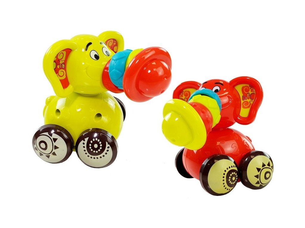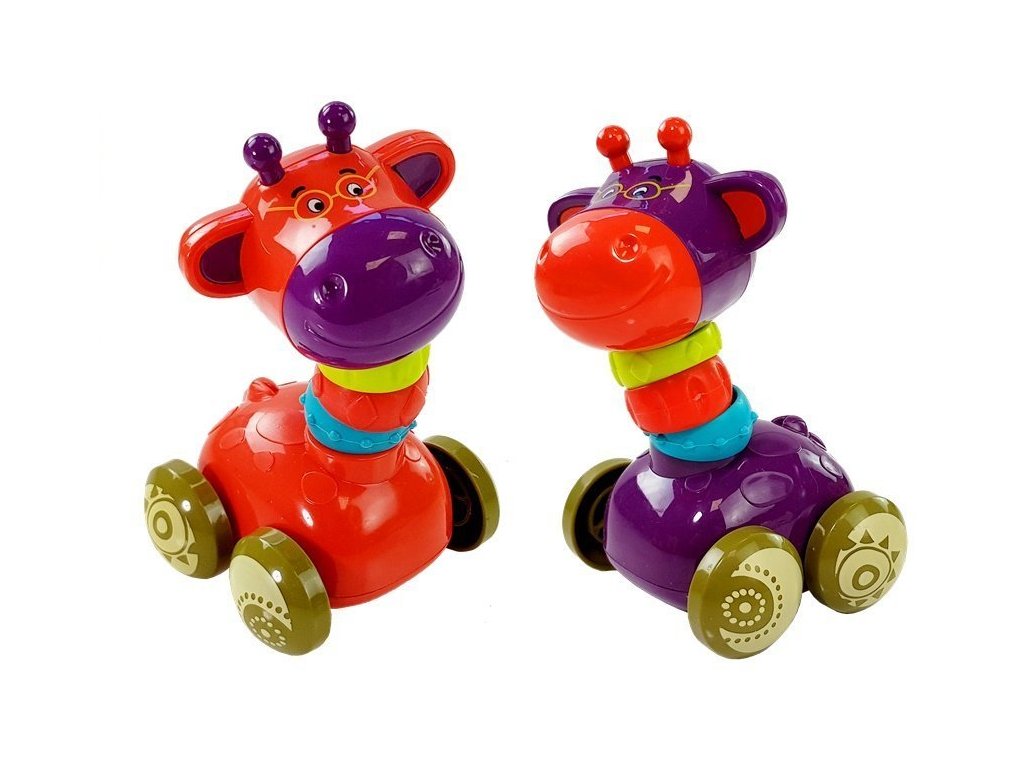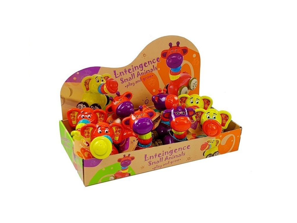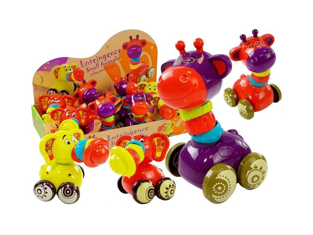 Колички със слон и жираф за най-малките предлагат забавна и цветна играчка. Слонът има на хобота си три гумени пръстена и пластмасова шапка накрая. Вратът на жирафа е украсен с червени, тюркоазени и зелени гумени пръстени. Хоботът на слона и вратът на жирафа са закрепени на ластик, което позволява да бъдат разтегнати. По време на игра весело църцори.