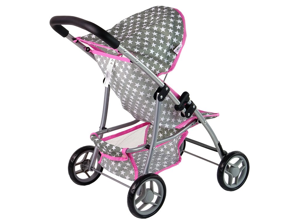 Коляската е оборудвана с четири колела, осигуряващи лесно управление и стабилност дори на неравни повърхности. Сивият цвят с бели звездички и розова рамка ще привличат вниманието на момичето и ще го насърчават да играе. Под седалката има малко пространство за съхранение, подходящо за аксесоари и принадлежности както за куклата, така и за детето. Още една голяма полза е, че коляската е сгъваема – лесно се побира в колата и може да бъде взета на семейни излети.