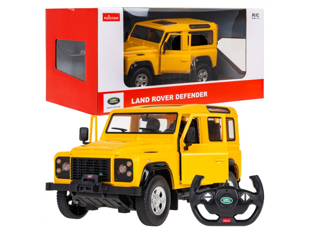 Количка с дистанционно управление Land Rover Defender Rastar 1:14 жълта е лицензиран продукт на компанията Rastar. Изработена е в мащаб 1:14. Дистанционното управление работи на честота 2,4 GHz.