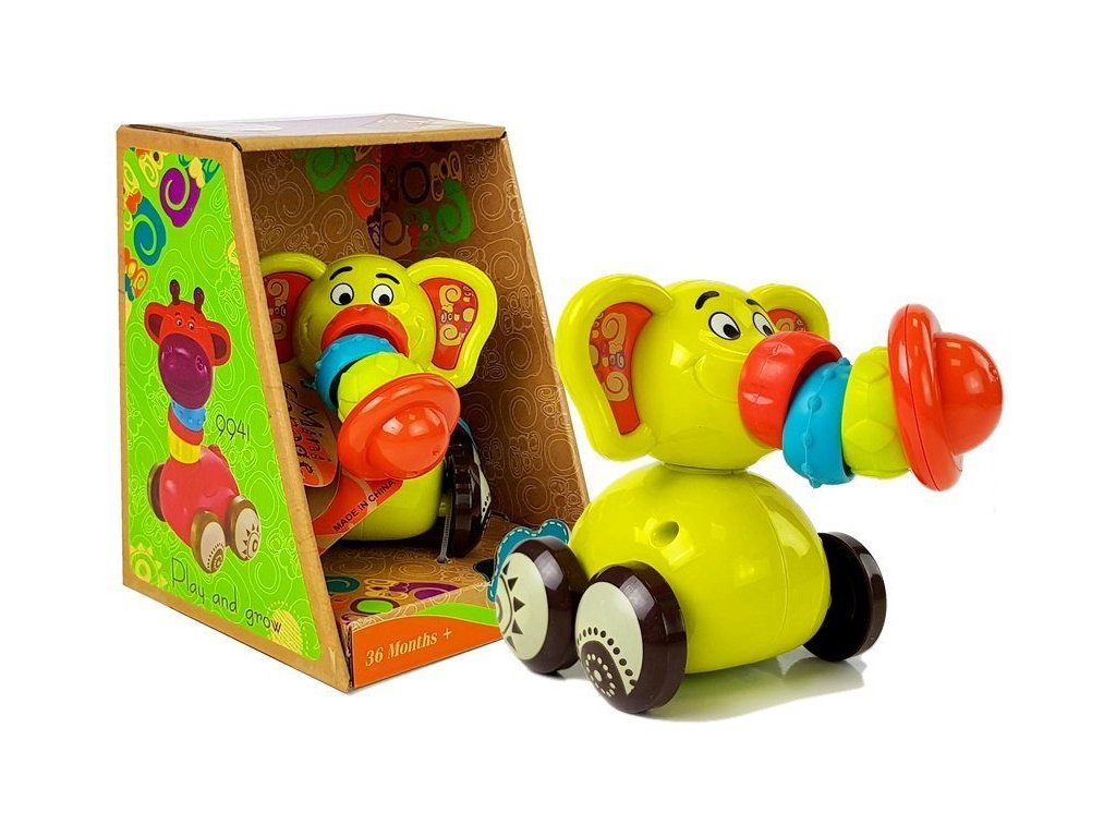 Слончето има 4 колела като количка, позволява движение по пода или мебелите, а в същото време се чува приятно звънтене.