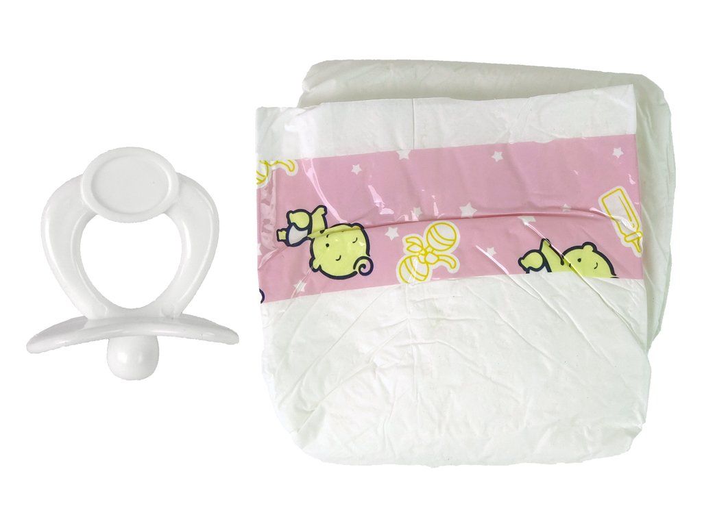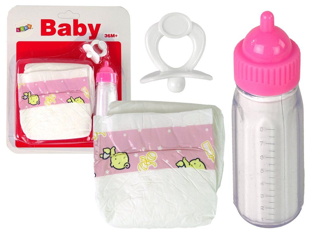 Комплект аксесоари за кукли е изключително сладък комплект, който пренася малките момичета в света на играта на домакинство и семейни грижи. В комплекта има прозрачна бутилка с бял външен слой, имитиращ мляко, бяла залъгалка и сладка бяла пелена с розови мотиви.