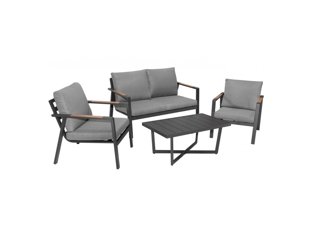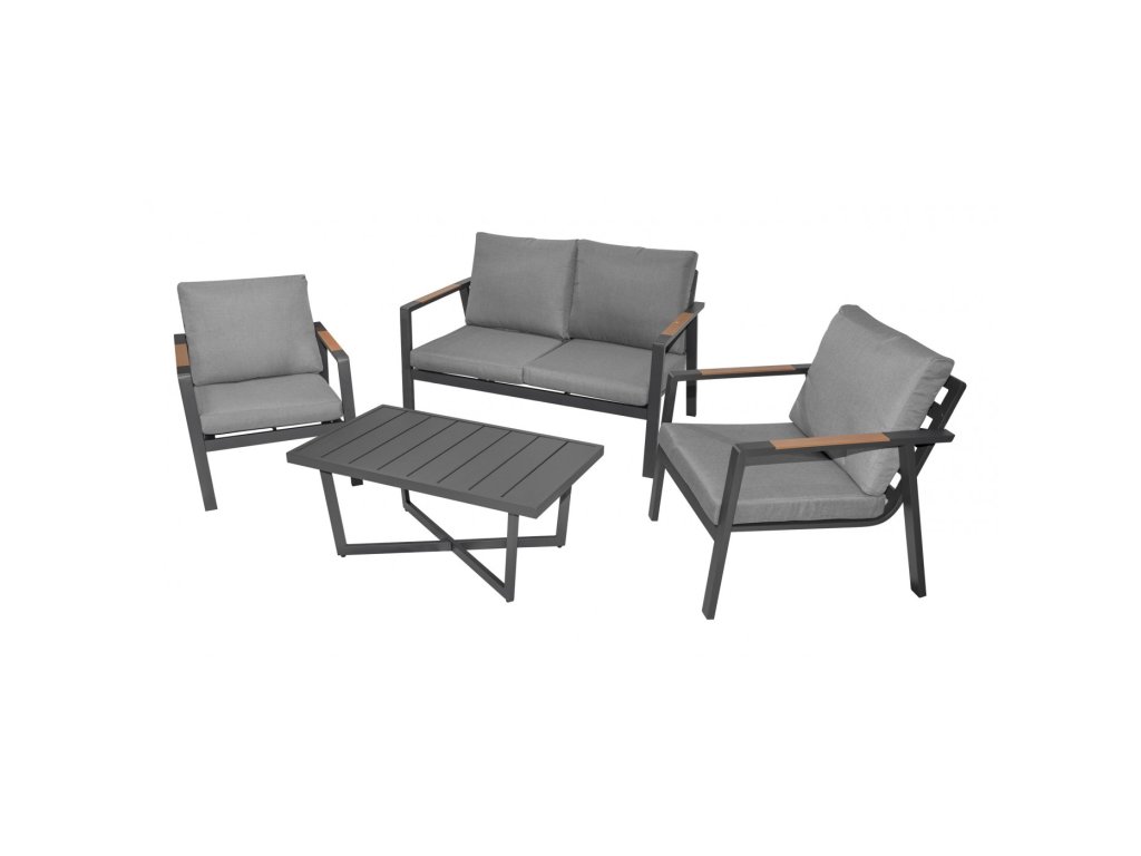 Конструкцията на всички елементи от комплекта алуминие мебели с маса сив е изградена на основата на алуминиеви рамки, които придават лекота и устойчивост на комплекта срещу атмосферни влияния. Благодарение на използването на висококачествен алуминий, комплектът е напълно устойчив на корозия.