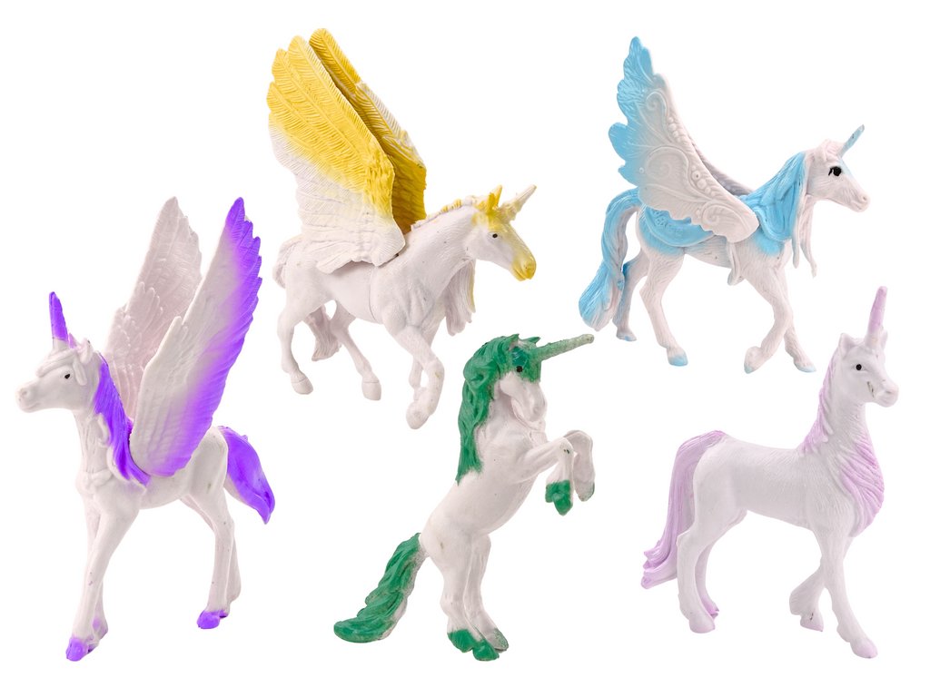 Неизпитана колекция от фигури на еднорози и пегаси, която ще омагьоса всеки почитател на магията и фантазията. Всяка фигурка е с красиви, разгърнати крила, придаващи й величествен вид, вдъхновен от митичния пегас. Крилата са изработени с детайлна прецизност, с ясно изразено перушина, което добавя реалистичен и магичен облик. Фигурките са налични в различни, атрактивни цветови комбинации, които привличат вниманието и стимулират въображението. В комплекта са включени еднорози в бяло-лилаво, бяло-златно, бяло-розово и бяло-зелено.