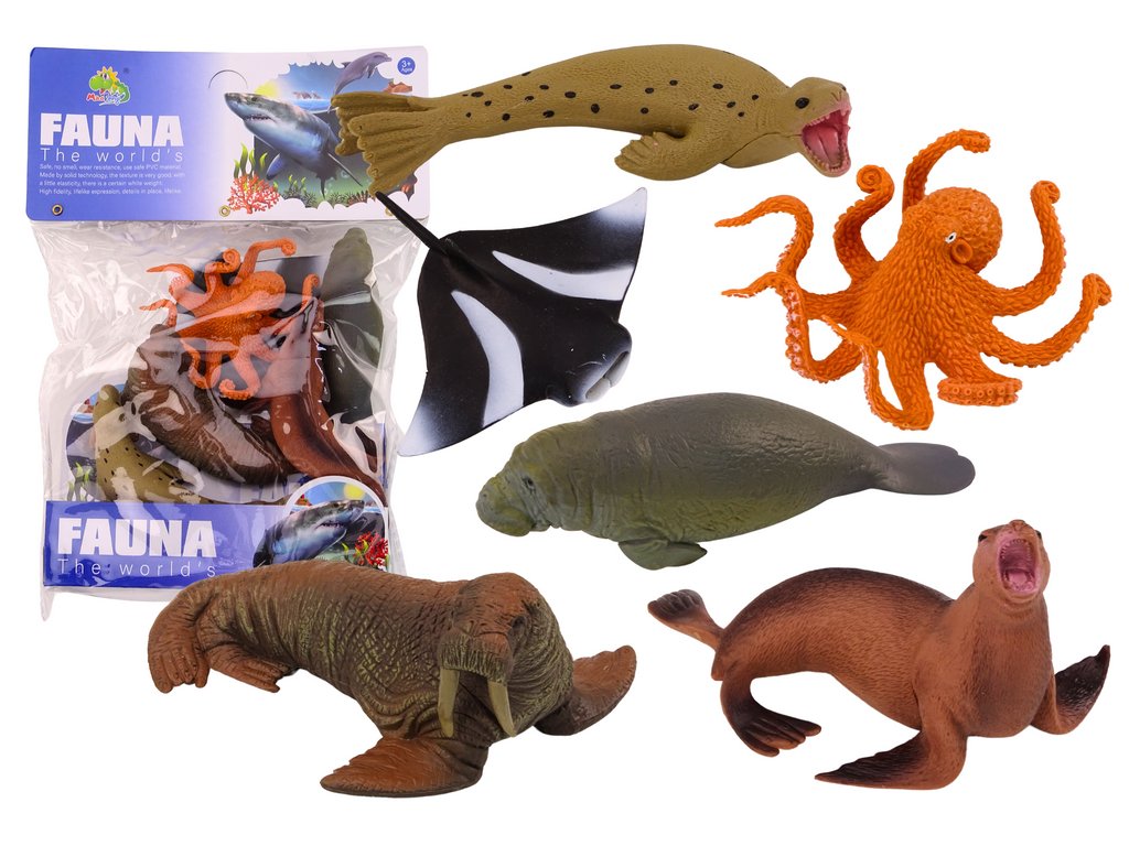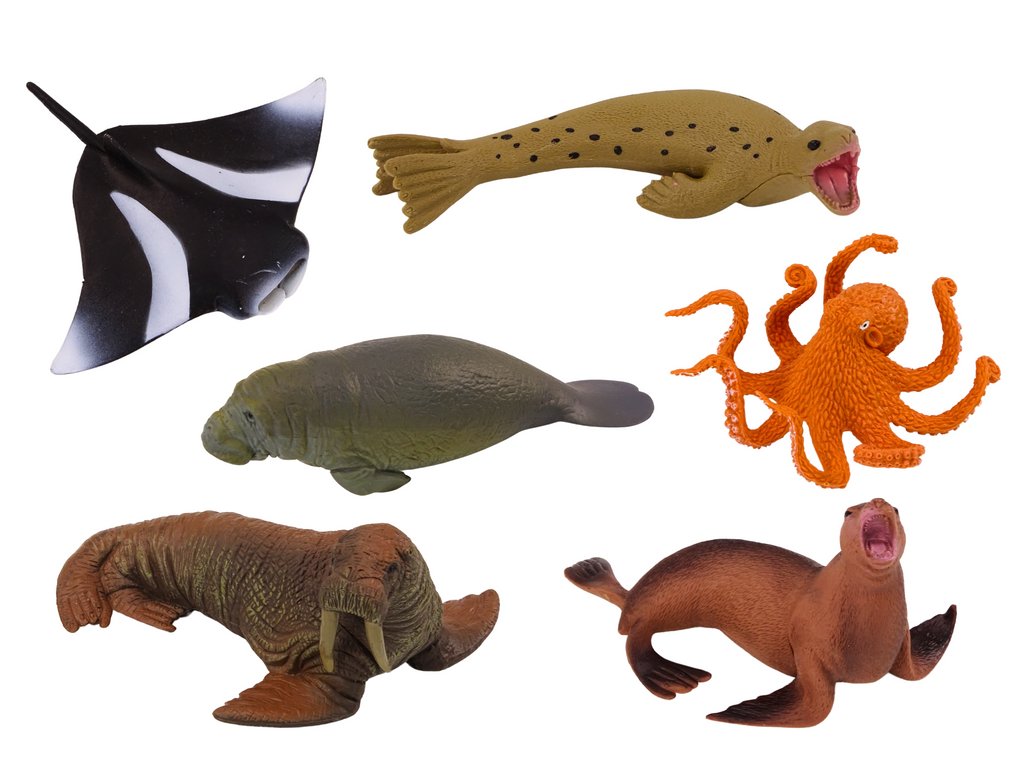 Комплектът от морски животни предлага вълнуващо приключение в света на загадъчния океан. Включва 6 реалистично изработени фигурки, които отразяват разнообразието на морския живот. В комплекта ще намерите октопод, морж, два тюлена, ламантин и скат. Всяка фигурка е внимателно проектирана, за да пресъздаде естествените характеристики и поведение на своя реален прототип.