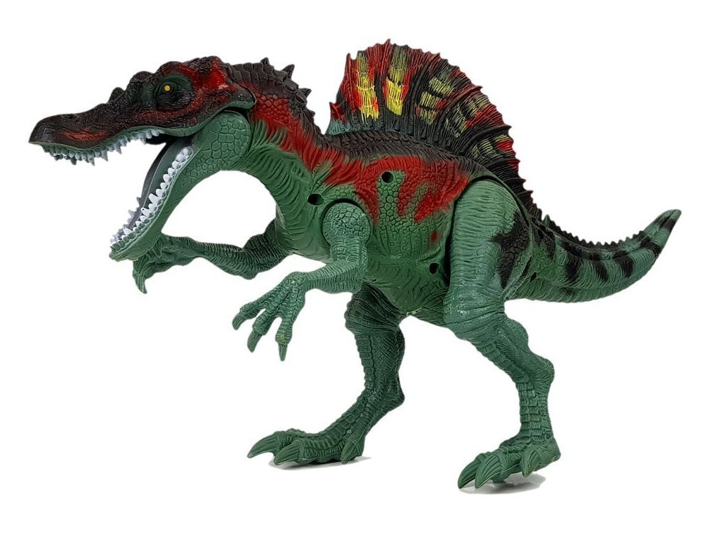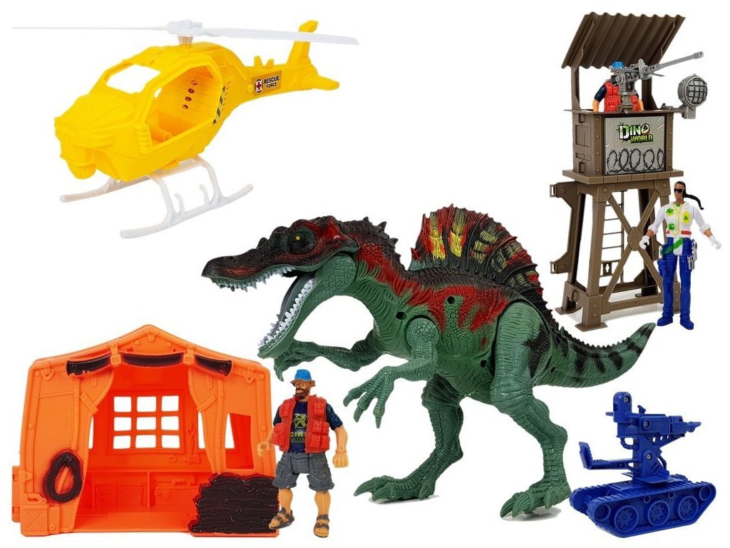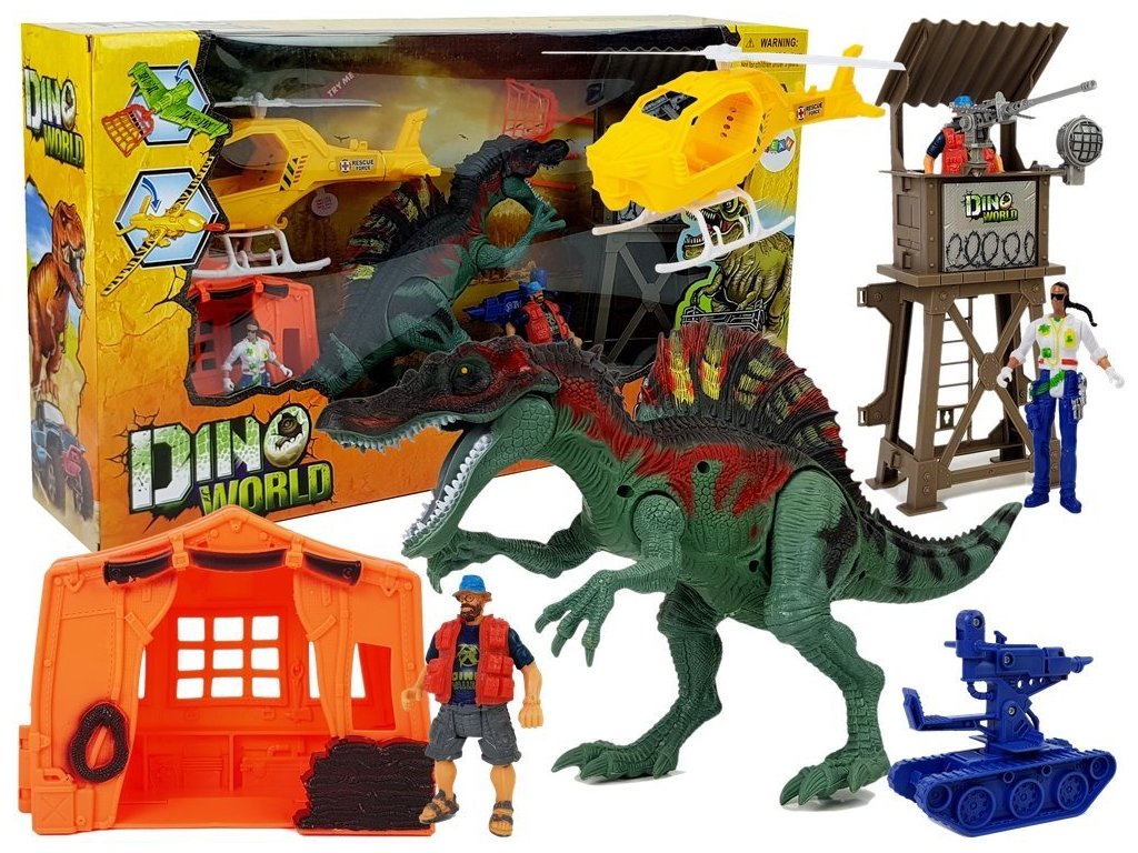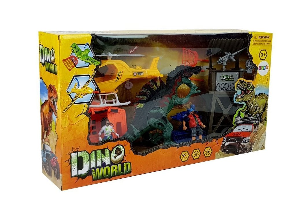 Динозавърът издава звуци и очите му светят с червени LED диоди. Активира се при движение на едната от предните му лапи. Превозното средство с изстрелващо оръдие ви позволява да „уловите“ този праисторически звяр. Хеликоптерът осигурява наблюдение на терена от птичи поглед и издава звуци при излитане.