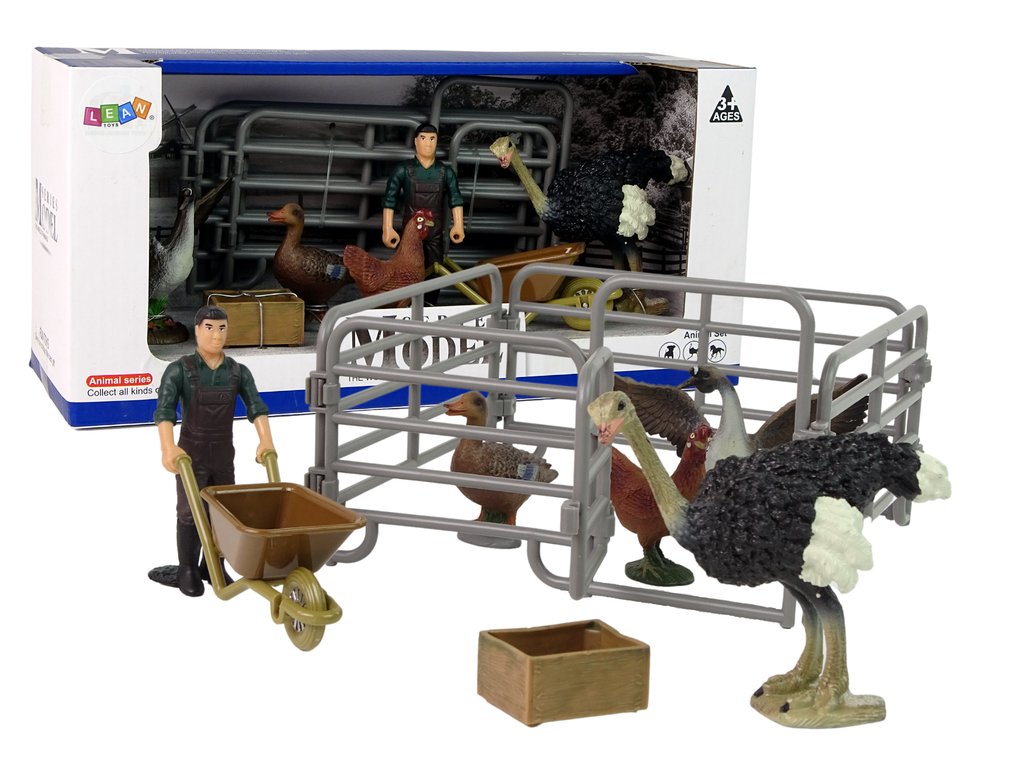 Изработените фигурки имитират истинските версии на тези животни, като при производството е обърнато специално внимание на детайлите. Играта с фигурките осигурява много забавление за децата. Оставете ги да развиват въображението си, докато прекарват свободното си време с нашия комплект. Размерите на моделите са отлично пригодени за малките детски ръчички, което също тренира захвата и прецизността. В клетката има различни птици - щраус, кокошка, гъска и патка. Птиците са една от основните животински групи, които могат да бъдат открити на ферма. В комплекта е включен и фермер с количка, който доставя необходимите вещи до ограждението.