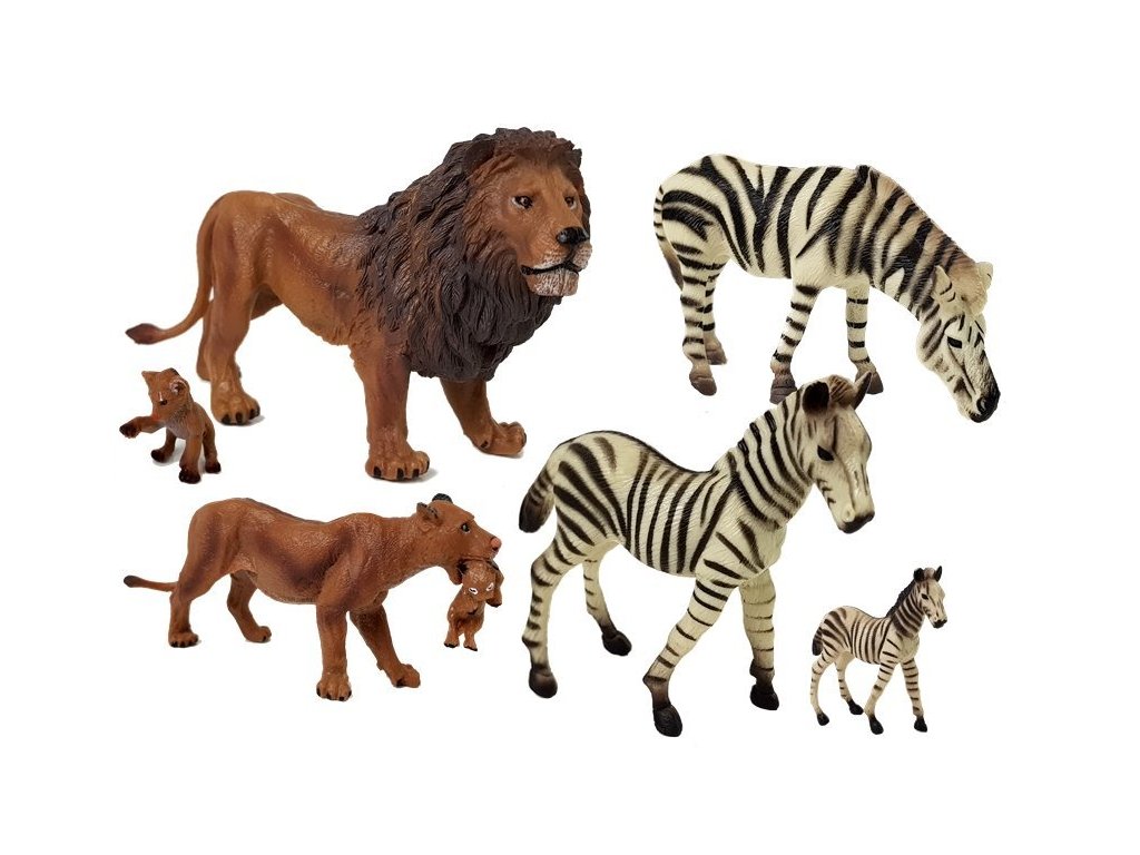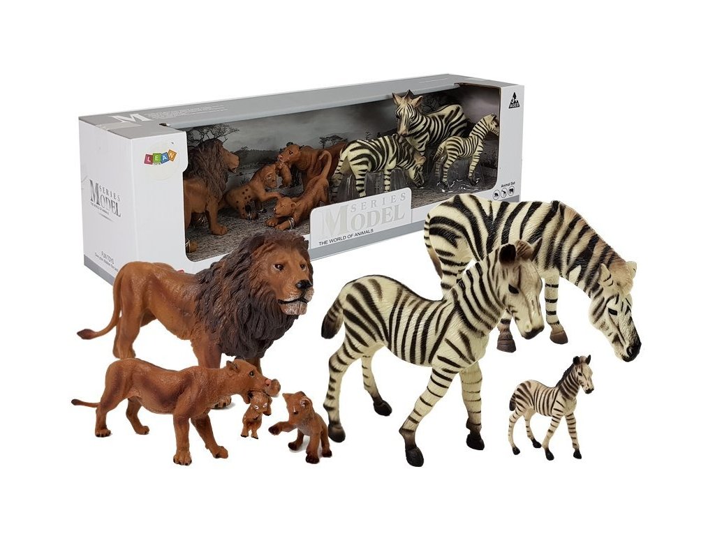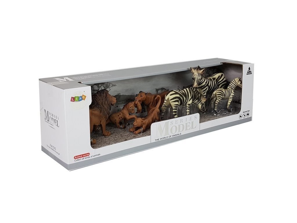 Всяка фигурка е внимателно отлята от пластмаса и старателно ръчно боядисана, като точно пресъздава външния вид на животното. Фигурките са произведени от висококачествени материали, изработени от здрава гума с прецизни детайли. Събирането на африкански фигурки може да се превърне в красиво хоби и да Ви помогне да опознаете външния вид и животa на дивите животни. Комплектът съдържа 7 фигурки, изобразяващи лъвове и зебри на различни етапи от техния живот – от малки бебета до възрастни животни.