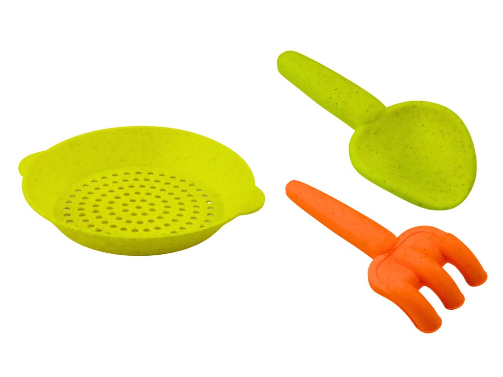 Освен това комплектът съдържа практични аксесоари, като сито за пресяване на пясък, гребло за моделиране и лопатка за строеж, всички в приятни нюанси на зелен цвят. Това дава възможност на децата не само да се забавляват, но и да учат чрез експериментиране с различни техники и форми.