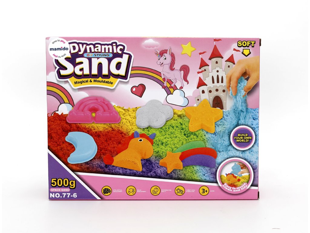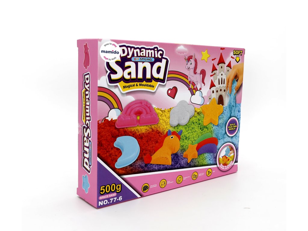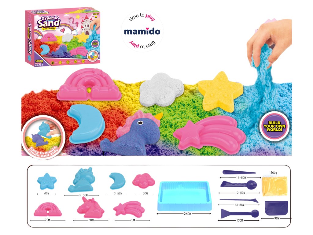 Цветен кинетичен пясък с еднорози и дъга за малки творци. Пясъкът се оформя приятно, запазва формата си и не се разпилява като обикновен пясък – идеален за творчество на закрито. Включена е комплект от формички с мотиви на дъга, звездички, еднорог, луна и други форми. Страхотна активност за спокойно забавление у дома.