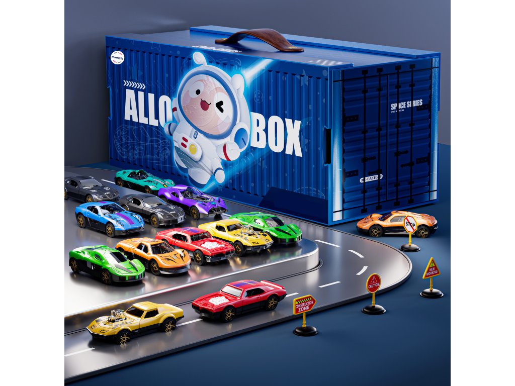 Стилен колекционерска кутия, пълна с цветни състезателни колички за любителите на скоростта. Отворената кутия във формата на куфар служи не само за съхранение на колите, но и като писта за игра – идеална за вкъщи, за пътуване, или като оригинален подарък.