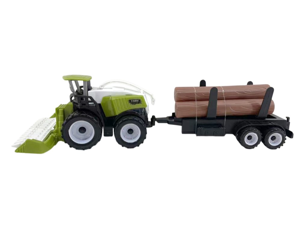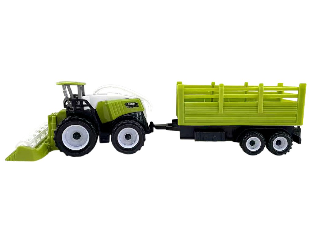 Реалистичен комплект от три селскостопански комбайна с ремаркета ще зарадва всички малки фенове на селскостопанските машини. Всеки комбайн има собствена косачка и прикачено ремарке към него – цистерна за вода, ремарке за дърва и товарен селскостопански ремарке. Благодарение на детайлната изработка и здравата пластмасова конструкция, децата могат да се насладят на часове игра на фермери.