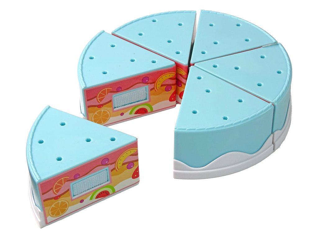 Тортата се състои от шест парчета, които могат да се съединят заедно. След разрязване ще се открият различни плодове, които детето може да открие. Специалният пластмасов нож позволява лесно отделяне на парчетата едно от друго.