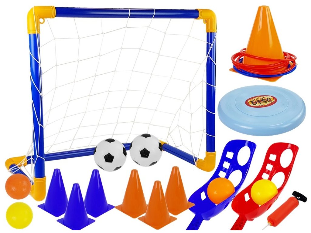 Комплект спортни игри за градина позволява на децата да се забавляват активно както на открито, така и в домашни условия. Комплектът включва фризби, футболна врата с мрежа, конуси и топка, обръчи и конуси, които помагат на детето да се научи да хвърля точно и игра, при която единият хвърля топката, а другият се опитва да я улови с ръкавица.