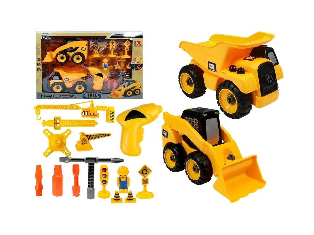 Съдържанието на комплекта с превозни средства със сглобяеми винтове ще заинтригува не само малките деца, но и по-големите братя и сестри, родители и баби и дядовци. В комплекта са включени двата най-типични строителни превозни средства, които може да срещнете на строителна площадка: багер и самосвал. Те са в жълти цветове, които точно отразяват реалните им аналози. В колелата и подвижните части на двете превозни средства има пластмасови винтове, които малкият майстор може да разхлаби и завие с помощта на отвертки и гаечни ключове, включени в комплекта.