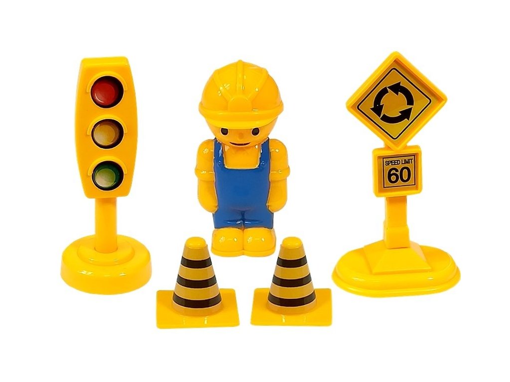 Освен превозните средства, комплектът включва и кран, няколко пътни знака, бариера и фигурка на малък строител. Всички елементи са идеални за игра с целия комплект или с отделните превозни средства.