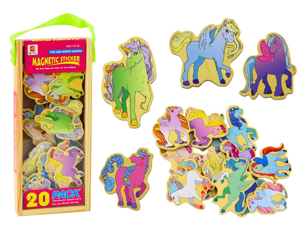 Комплект цветни дървени магнити еднорози 20 броя е необикновена играчка, която ще зарадва всеки малък любител на магията и фантазията. Всеки от 20-те магнита изобразява красиво изработени, цветни еднорози, които развиват детското въображение и вдъхновяват за креативна игра.