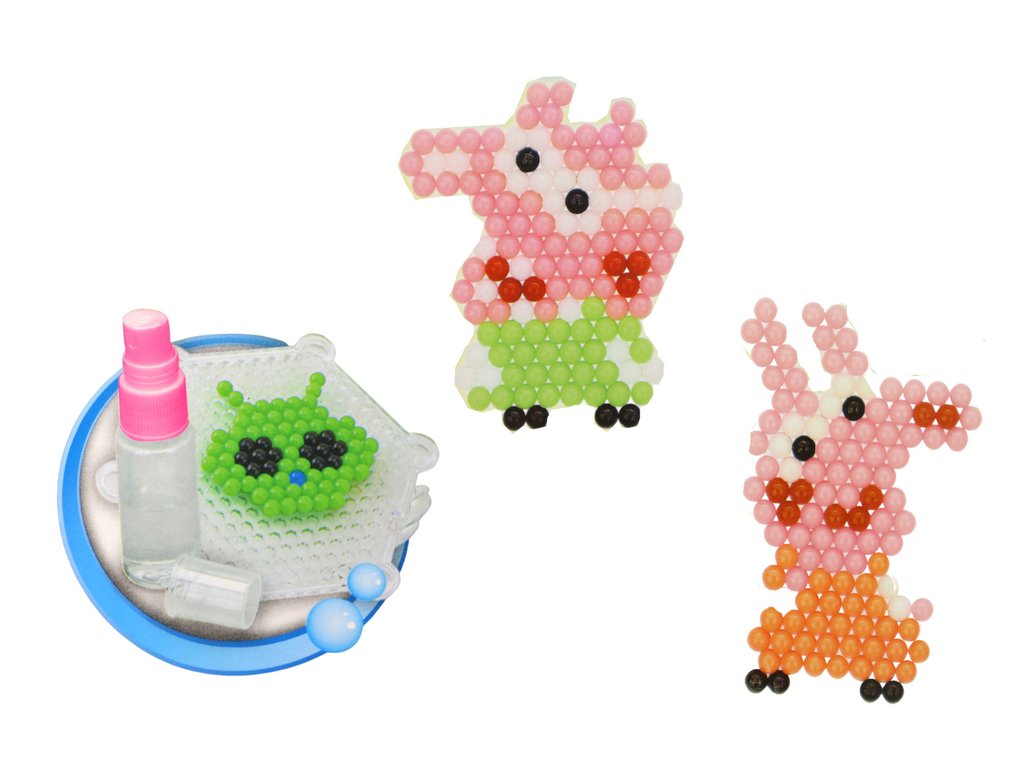 Комплектът включва два подложки – в квадратна и шестостенна форма, които позволяват създаването на разнообразни модели и композиции. Бутилка с вода улеснява овлажняването на мънистата за залепване.