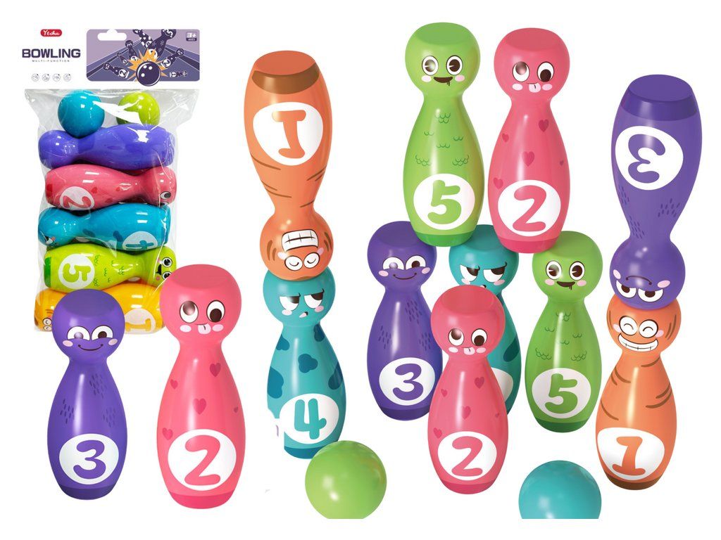 Комплектът съдържа 10 боулинг топки, всяка с различно личице и в различни цветове, което привлича вниманието на децата и ги насърчава към игра. Освен това топките имат плоски върхове, което позволява поставянето им една върху друга и изграждането на цветни кули. Това дава възможност на децата да се забавляват не само с класическата игра боулинг, но и с креативно подреждане.