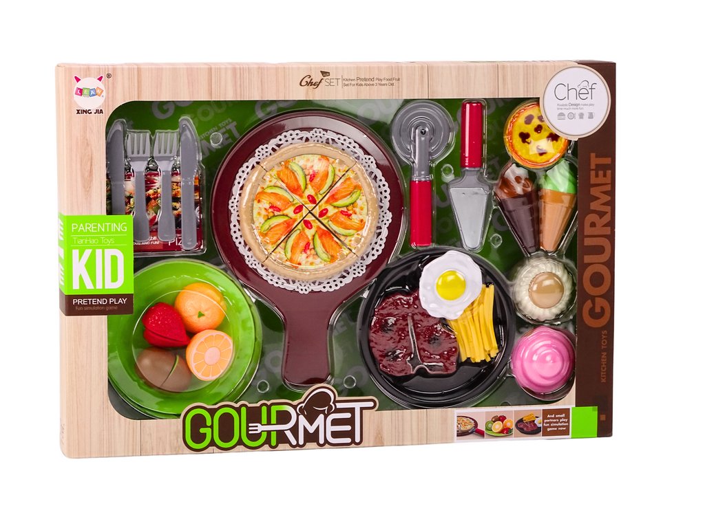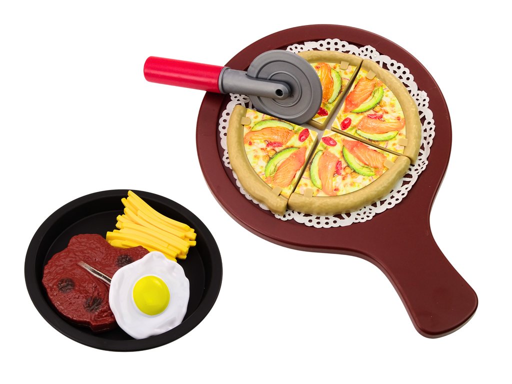 Комплектът включва пица, разделена на 4 парчета, които децата могат да сглобяват и сервират върху специалната тава. Ножът за пица позволява реалистично „рязане“ на пицата, което добавя автентичност към забавлението. Популярното лакомство, което винаги носи радост, е включено под формата на пържени картофи като допълнение към останалите ястия. Комплектът съдържа два сладоледа, идеални за десерт след вкусно хранене. Сладоледите са цветни и изработени с реалистични детайли.