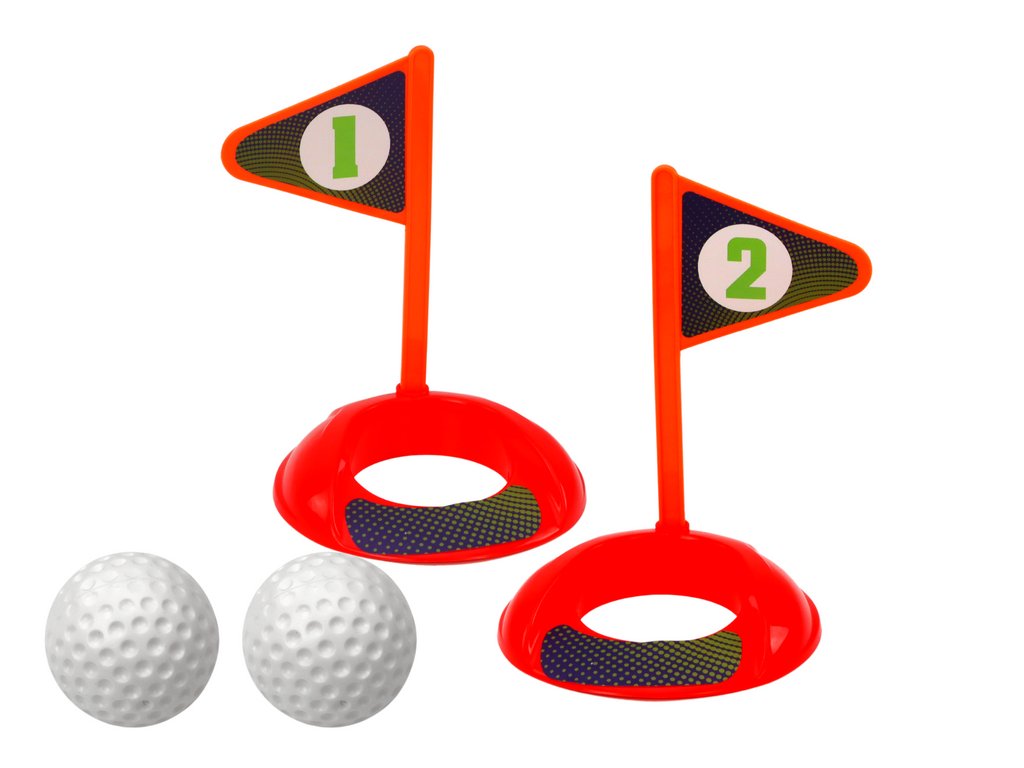 В комплекта са включени три различни стика с накрайници, които осигуряват разнообразие в играта и позволяват приспособяване към уменията и предпочитанията на детето. Пет топчета дават възможност за многократни опити и усъвършенстване на техниката, а две дупки с два флага създават реалистично голф игрище.