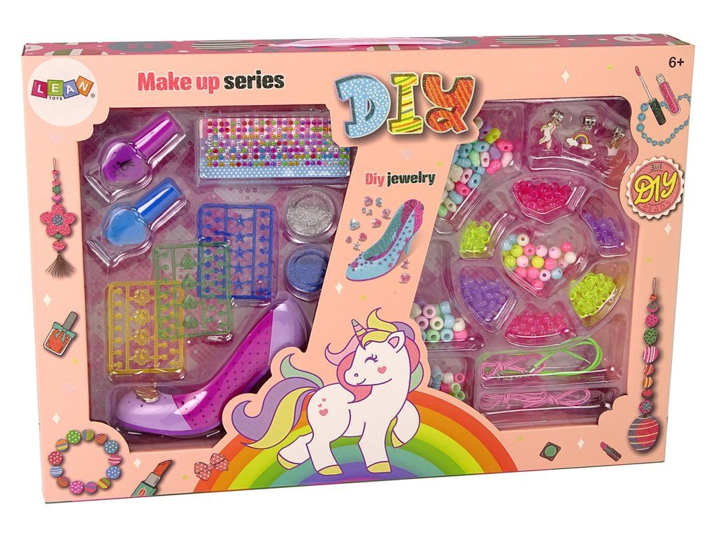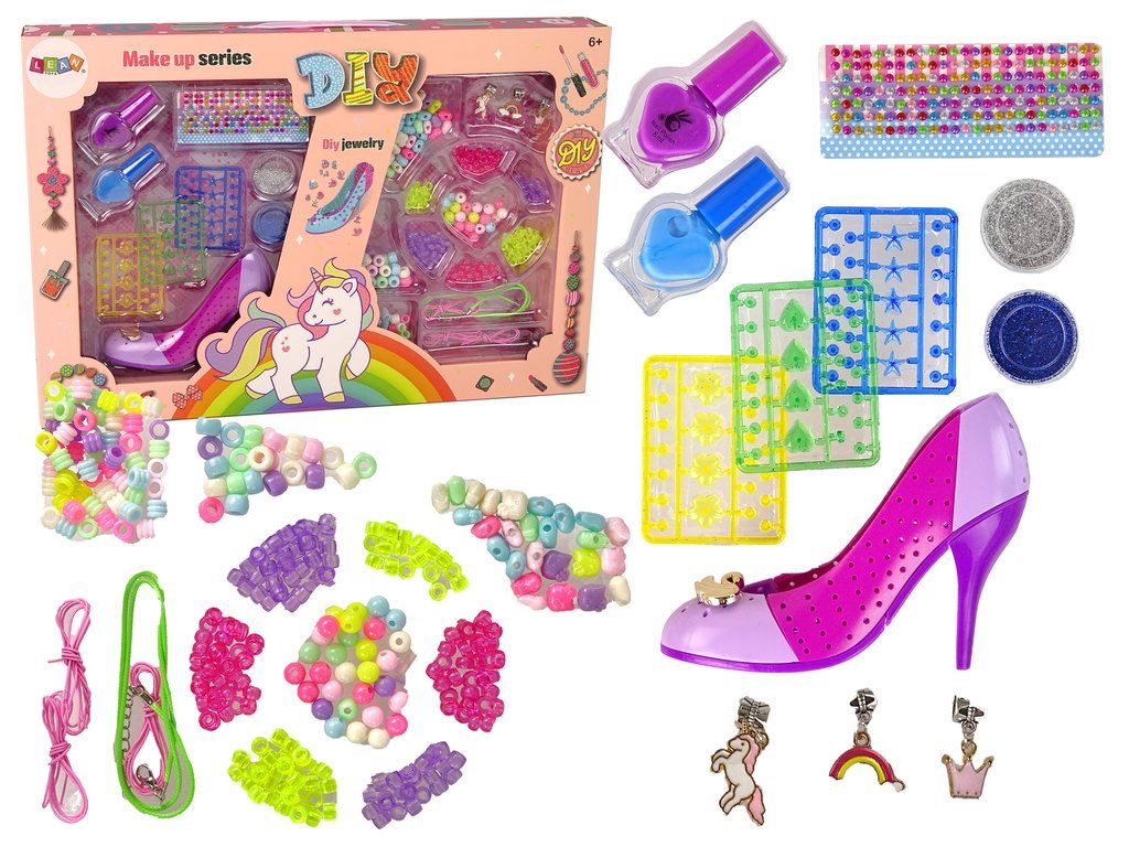 Главният акцент на комплекта е очарователната пластмасова обувчица, която служи като платно за вашата креативност. Закрепването на пластмасови мъниста е забавно и забавляващо занимание. Две комплекта с различни брокати придават блясък и магия на вашите проекти. Можете да ги поръсите върху обувчицата или други елементи, за да създадете искрящ ефект.