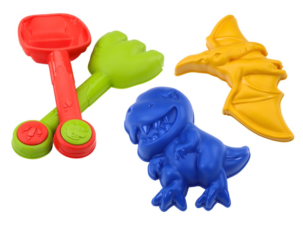 Комплект за пясък кофа, лопатка, гребло, формички динозаври