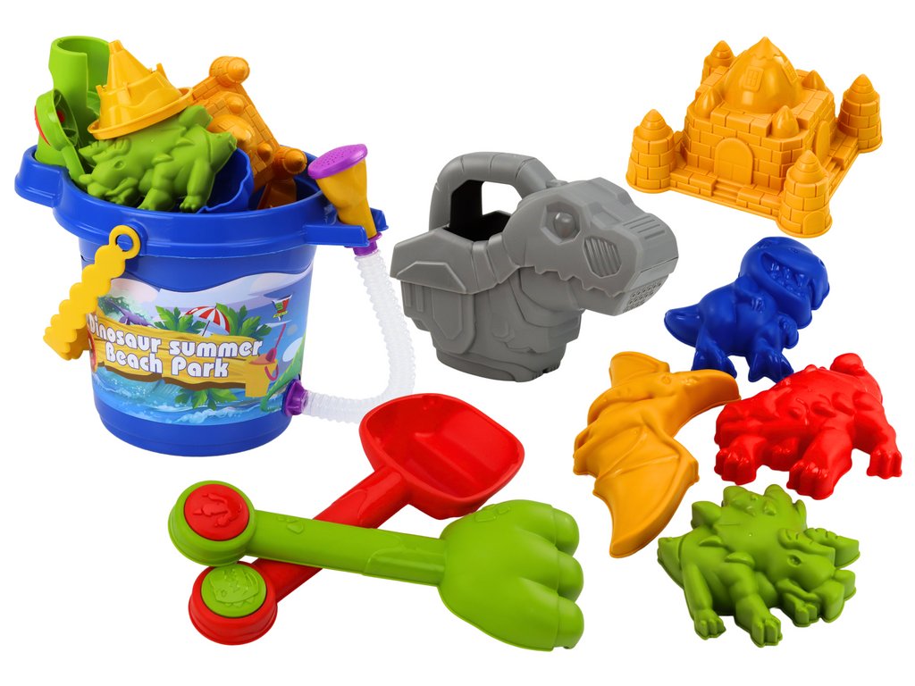 Комплектът за игра на пясък е перфектният избор за деца, които обичат игрите на открито. Основният елемент е кофа с душ, която предлага множество креативни възможности за забавление. Комплектът е украсен с мотиви на динозаври, което със сигурност ще зарадва малките любители на праисторическите създания.