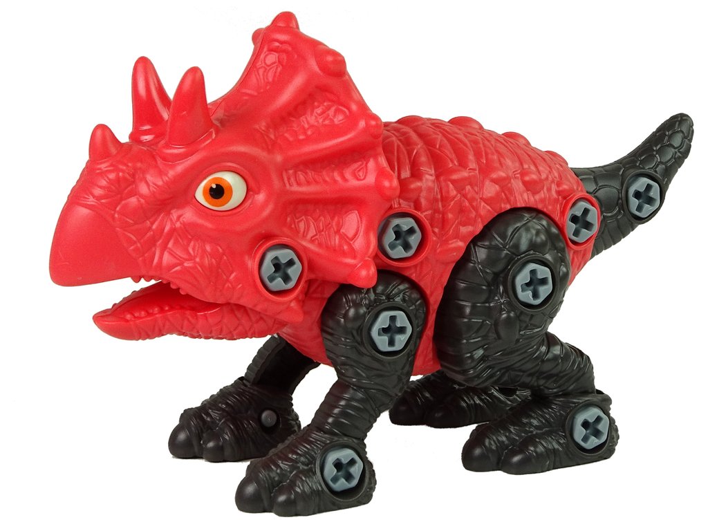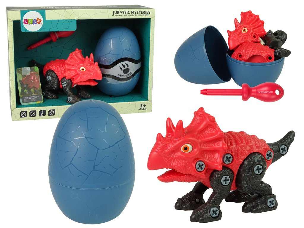 Конструктивен динозавър Трицератопс червен може да бъде разглобен с помощта на отвертка. След развиването всички части могат да се прибират в яйцето. Всички елементи са подвижни, което улеснява играта.