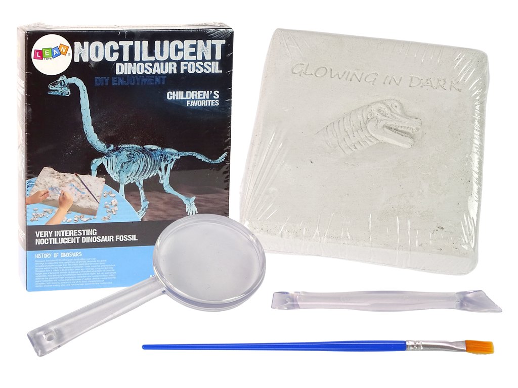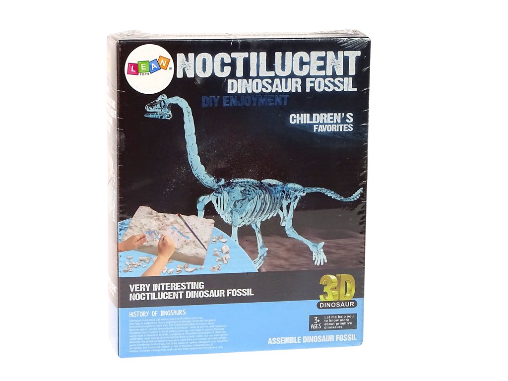 Скелетът е сглобяем – с помощта на приложените инструкции и включените инструменти детето ви може да събере динозавърския скелет. Костите светят в тъмното. След като почистите костите, ги подредете и ще се получи скелет на Брахиозавър.