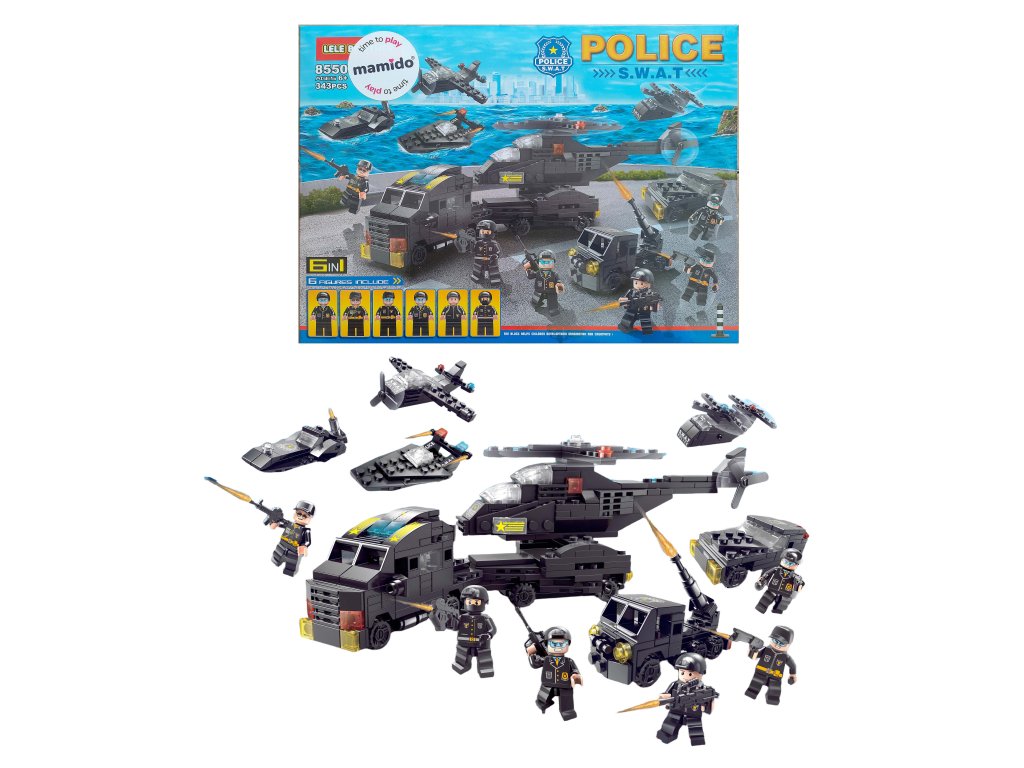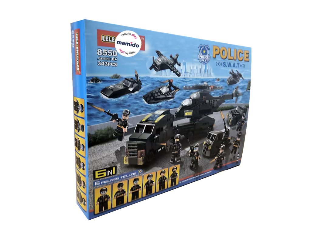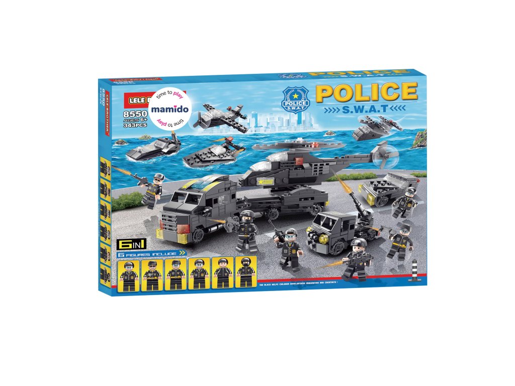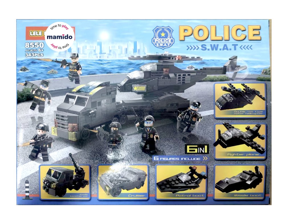 Конструкторът SWAT Полиция 6в1 е идеален за малки фенове на екшън, напрежение и полицейски мисии. От 343 части децата могат да построят до 6 различни модела – например хеликоптер с двойна роторна перка, патрулен катер, бронирана машина или боен самолет.