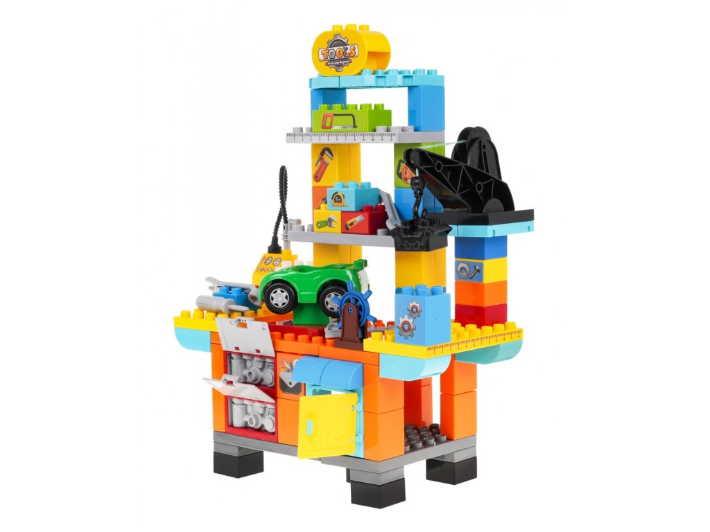 Конструктор работилница за деца, 92 части предназначен за игра и създаване на собствена работилница за деца от 3 години нагоре. Частите са изработени от висококачествени материали, напълно безопасни за детето. Работилницата включва малка количка, инструменти – отвертка, гаечен ключ, крик, както и помпа с пистолет за напомпване на гуми. Целият комплект съдържа общо 92 броя елементи.