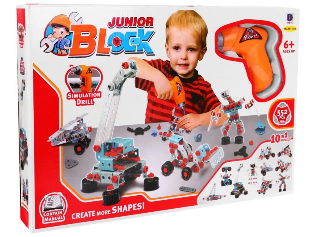 Все ние, малки и големи, обичаме да играем с конструктори. Комплектът Конструктор за малки майстори с бормашина 10в1 е предназначен за най-малките строители. Този комплект е истинско предизвикателство – всяко дете може да сглоби едно от две необикновени превозни средства и да играе с играчката, която е създало.