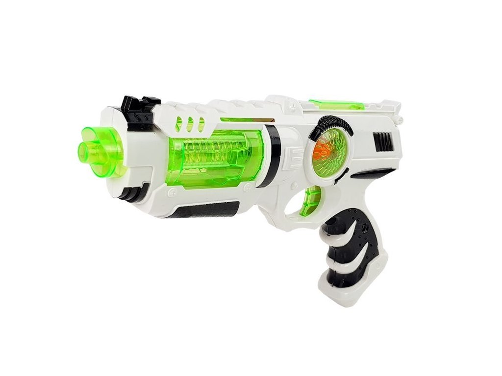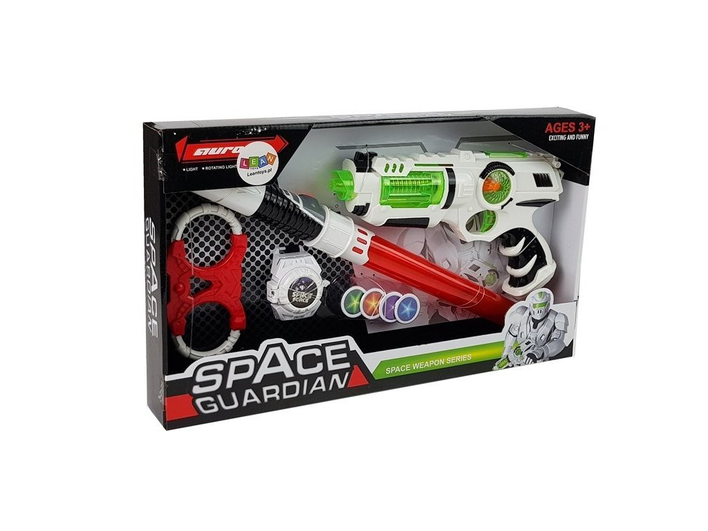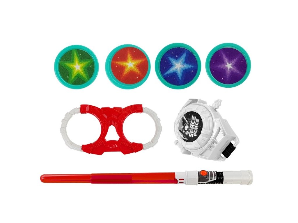 Представяме ви Космически светлинен меч и лазерна пистолета – комплект, включващ светлинен меч, лазерна пистолет и хвъргач на дискове. Пистолетът светва и издава звуци при натискане, същото важи и за светлинния меч. Тези играчки изглеждат още по-впечатляващо в затъмнена стая.
