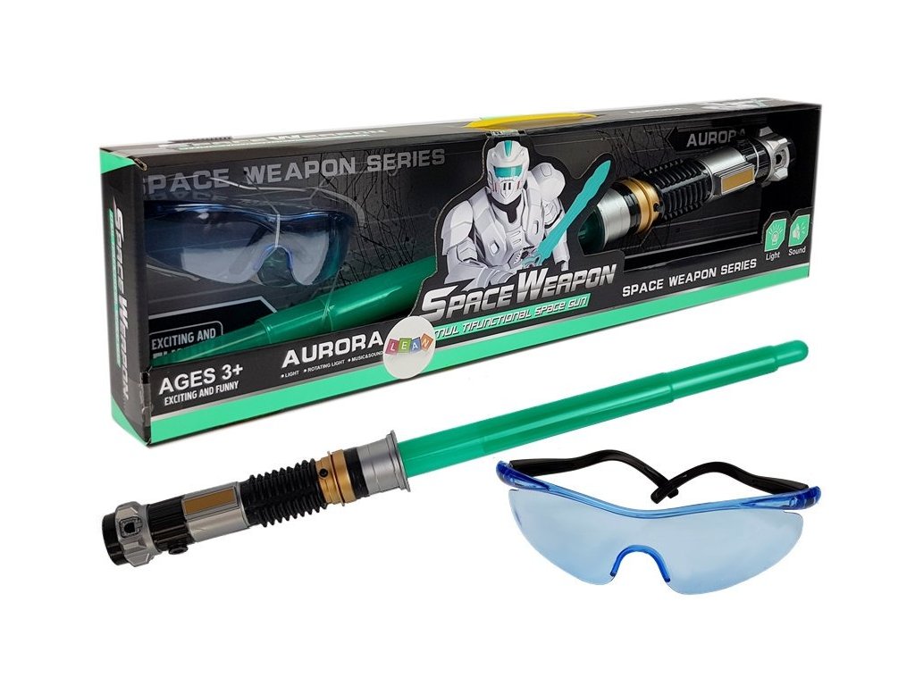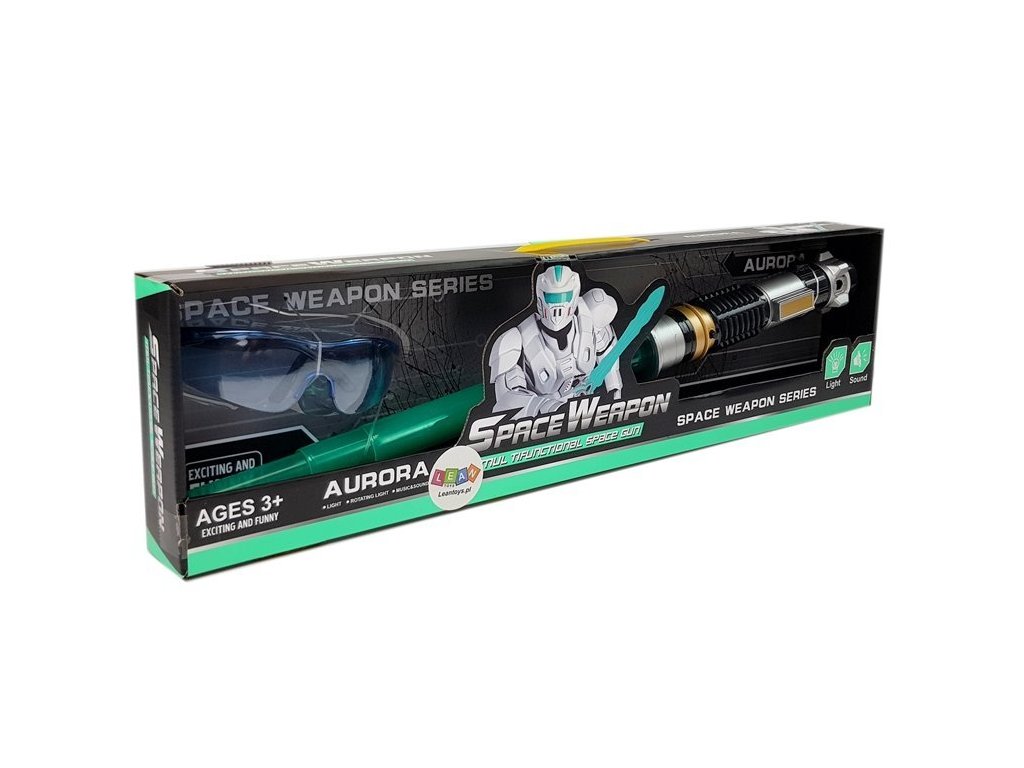 Комплектът включва Космически светлинен меч тюркоазен, който се разгъва напред, като достига дължина до 80 см. Когато мечът е включен, издава звуци сякаш директно от галактиката и свети с бяла светлина, преминаваща през тюркоазения прозрачен корпус.