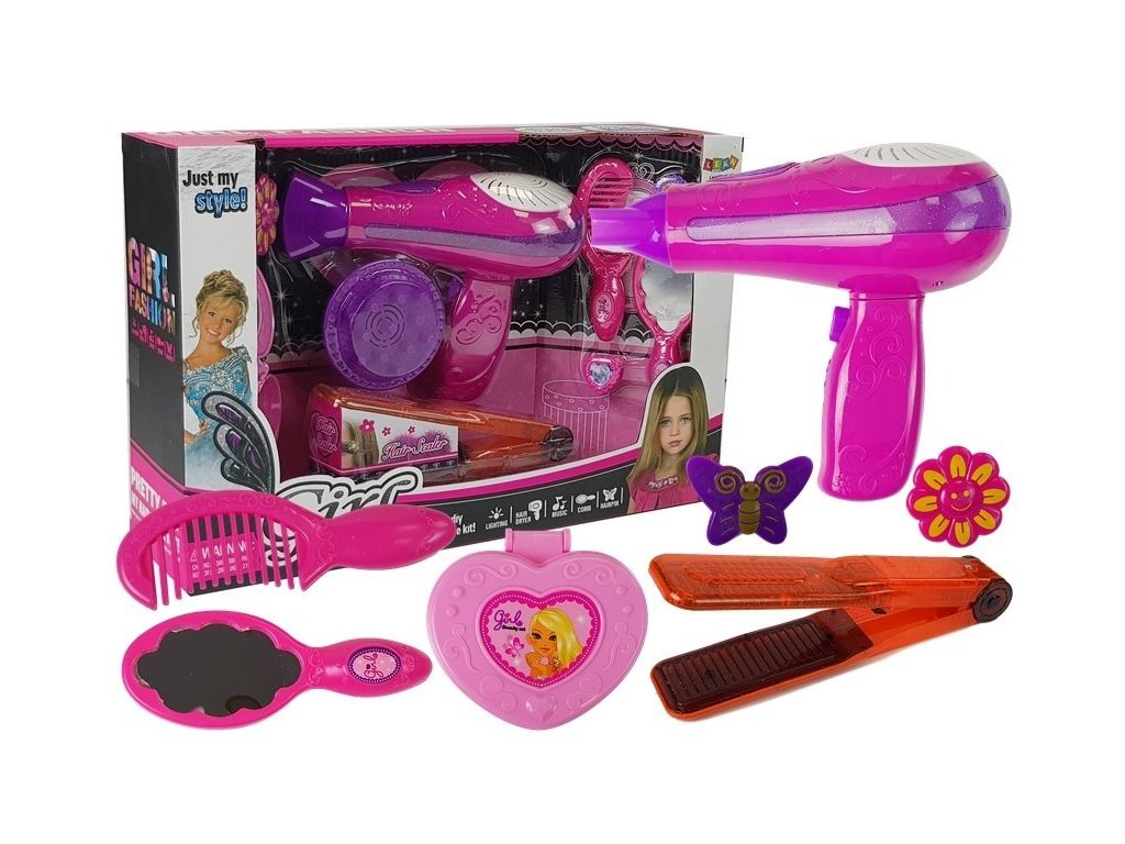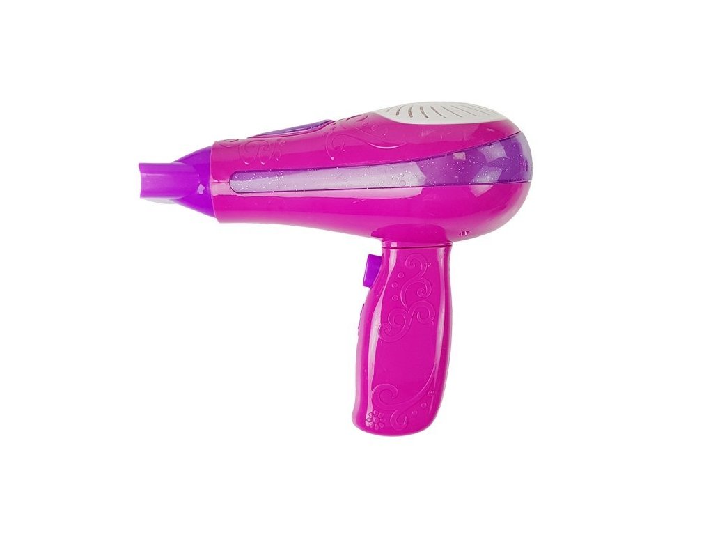 Козметичният комплект, пълен с различни аксесоари, позволява на момичетата да имитират своите по-големи сестри, приятелки и майки. Сешоарът има звукови ефекти. За работата на сешоара ще са ви необходими две батерии 1,5V „AAA“.
