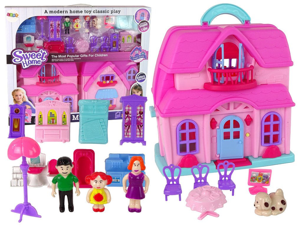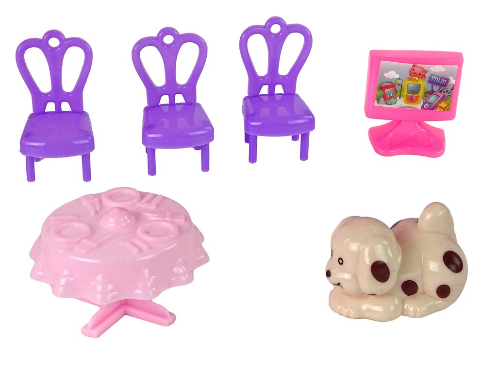 В комплекта са включени и сладки мебели и аксесоари, които обогатяват възможностите за игра и позволяват да обзаведете различни стаи за куклите. Къщата е оборудвана с отварящи се врати и балконски прозорец, които добавят реализъм към играта и осигуряват достъп до всеки ъгъл.