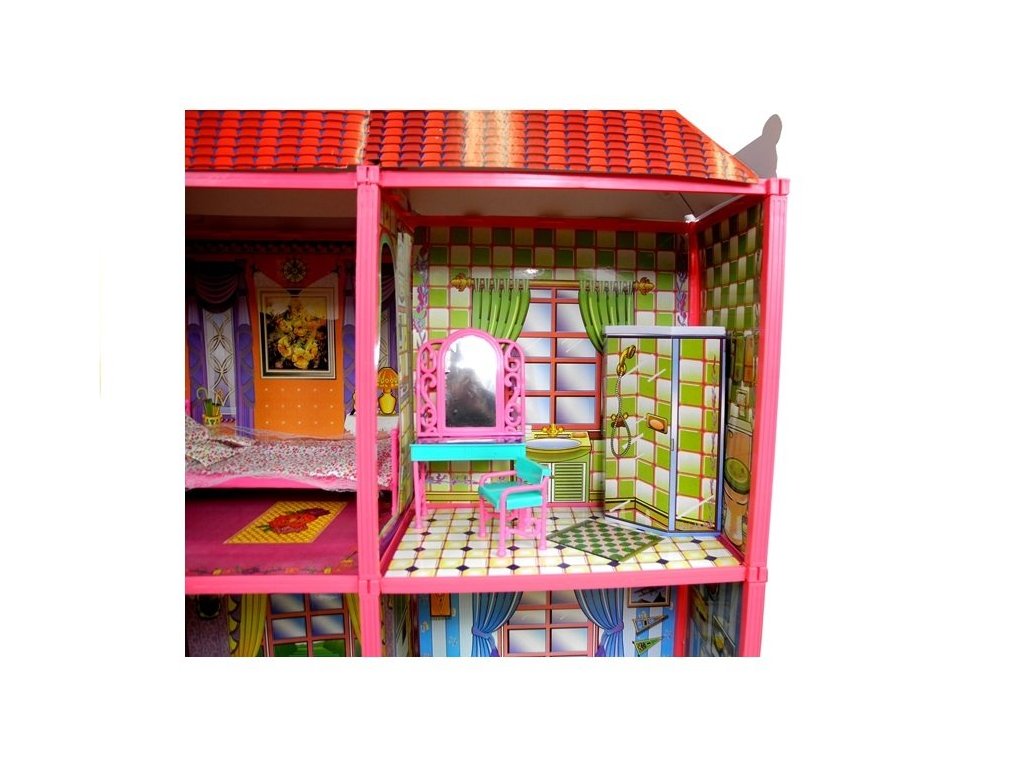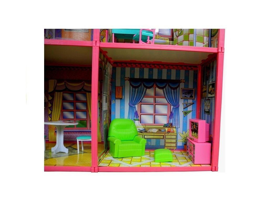 Къща за кукли с мебели включва 128 елемента. Къщата е изработена качествено, с ярки и привлекателни цветове и красиви стаи. На всеки етаж къщата разполага с просторни помещения за куклите или други играчки. Красивата къща има 6 отворени пространства, предназначени за ежедневна игра. Всяка стая е обзаведена според предпочитанията на малкия собственик. Конструкцията е изработена от пластмаса, а стените и покривът – от картон. Стаите са свързани помежду си, което позволява на куклите да се движат свободно между тях.