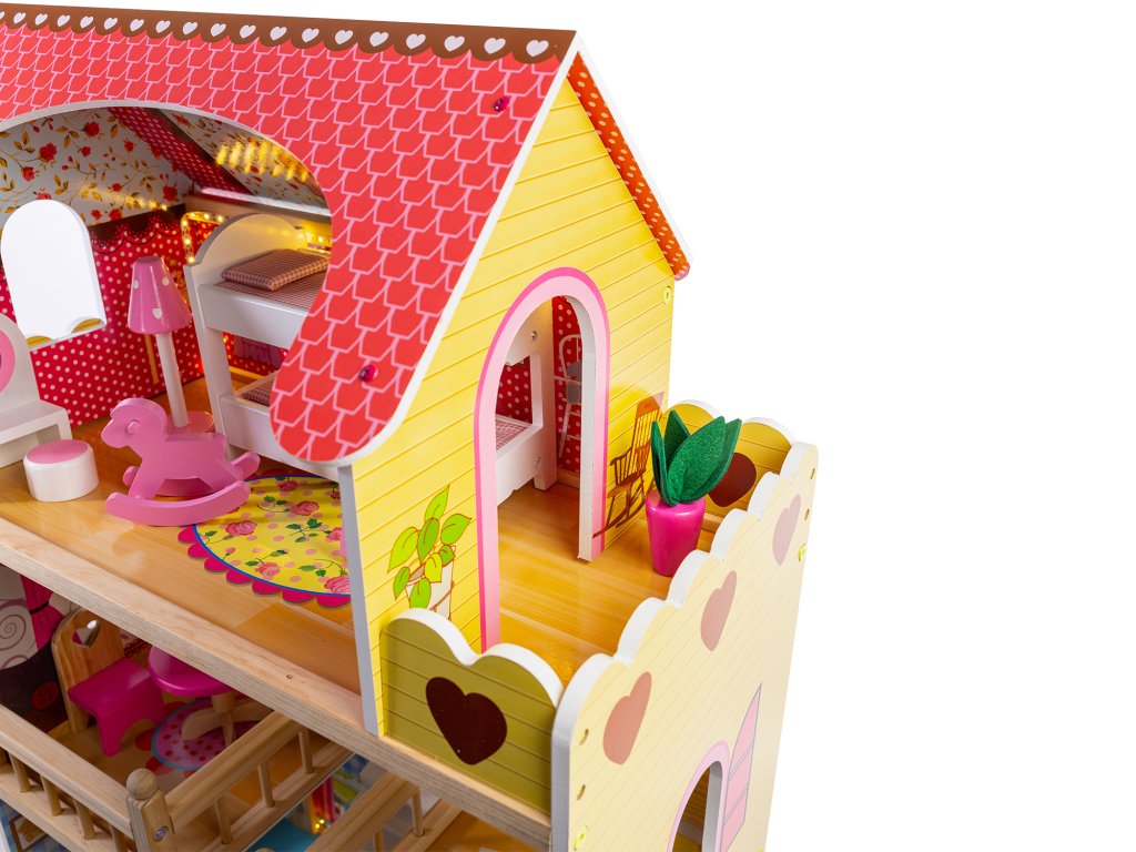 Голяма дървена къщичка за кукли Зола XXXL 90см + LED осветление и 16 бр. мебели – мечтата на всяко малко момиченце!