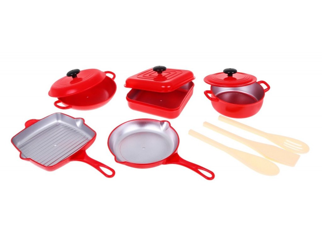 Този кухненски комплект съдове червен включва кухненски инструменти и допълнителни аксесоари, с които истинският готвач разполага. Всеки елемент от кухненския комплект е изработен от висококачествени материали, с реалистични цветове и форми, и с размери, съобразени с малките детски ръчички. Този 14-частен кухненски комплект е подходящ за деца над 3 години.
