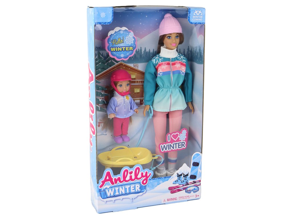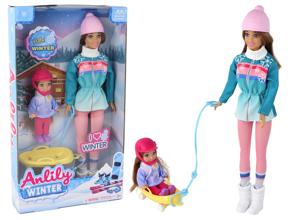 Кукла Анлили майка и дъщеря през зимата е очарователен комплект, който пресъздава сцена на зимни забавления в снега. Майката има дълга кестенява коса, която красиво пада, и носи розова шапка, която я предпазва от студа. Облечена е в зелено гащеризон, украсен с мотив на снежинки, както и с зимни панталони и обувки, подходящи за условията на шейниране.