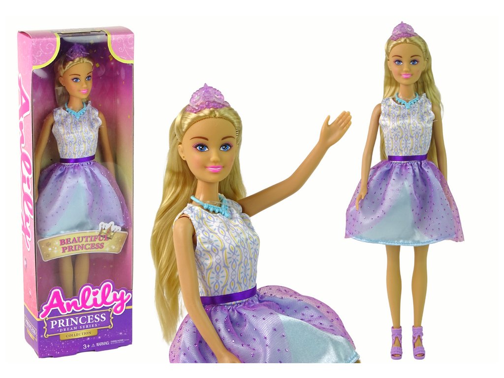 Тази очарователна кукла Anlily Принцеса лилава е истинска приказна принцеса. Изработена е от мек пластмасов материал, а красивата й лилаво-синя рокля и аксесоари придават на куклата изящество и чар.Куклата има дълга, бляскава руса коса, която я прави да изглежда като истинска принцеса. Косата е леко къдрава и е идеална за различни прически, които децата могат да създадат сами.