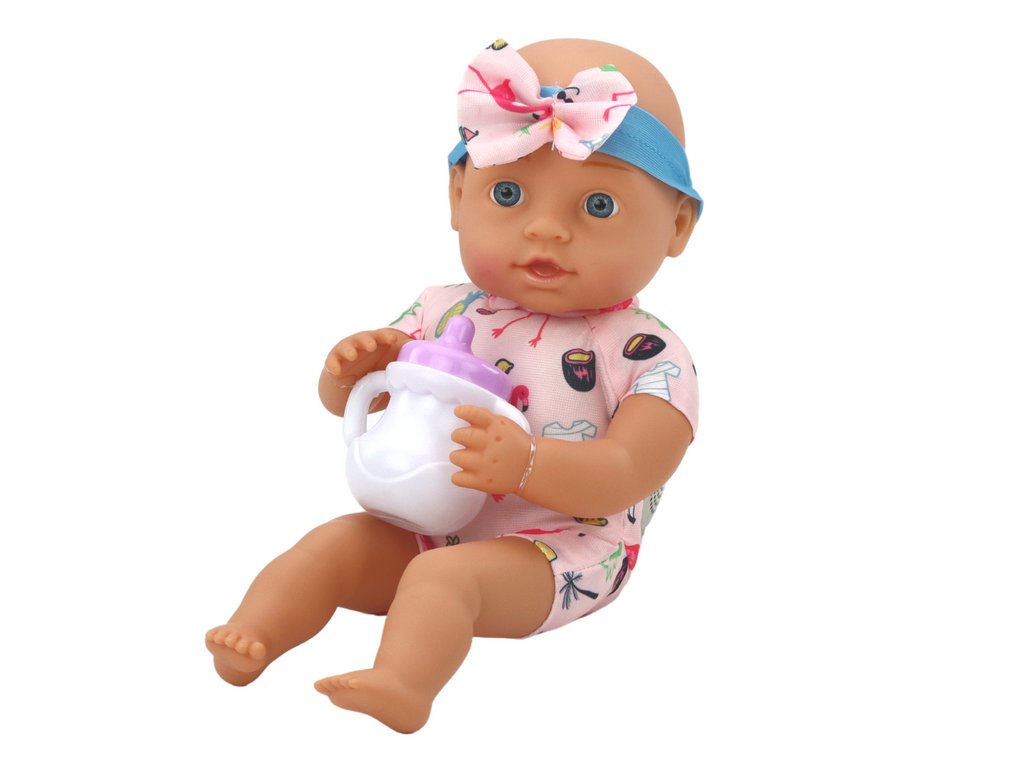 Очарователна кукла бебе! Облечена в светлорозов тоалет с фламинго и палми, допълнен от красива диадема с панделка, тази кукла излъчва нежност и сладост. Комплектът включва не само тази пленителна кукла, но и практични аксесоари – купичка с лъжичка и вилица, както и биберон.