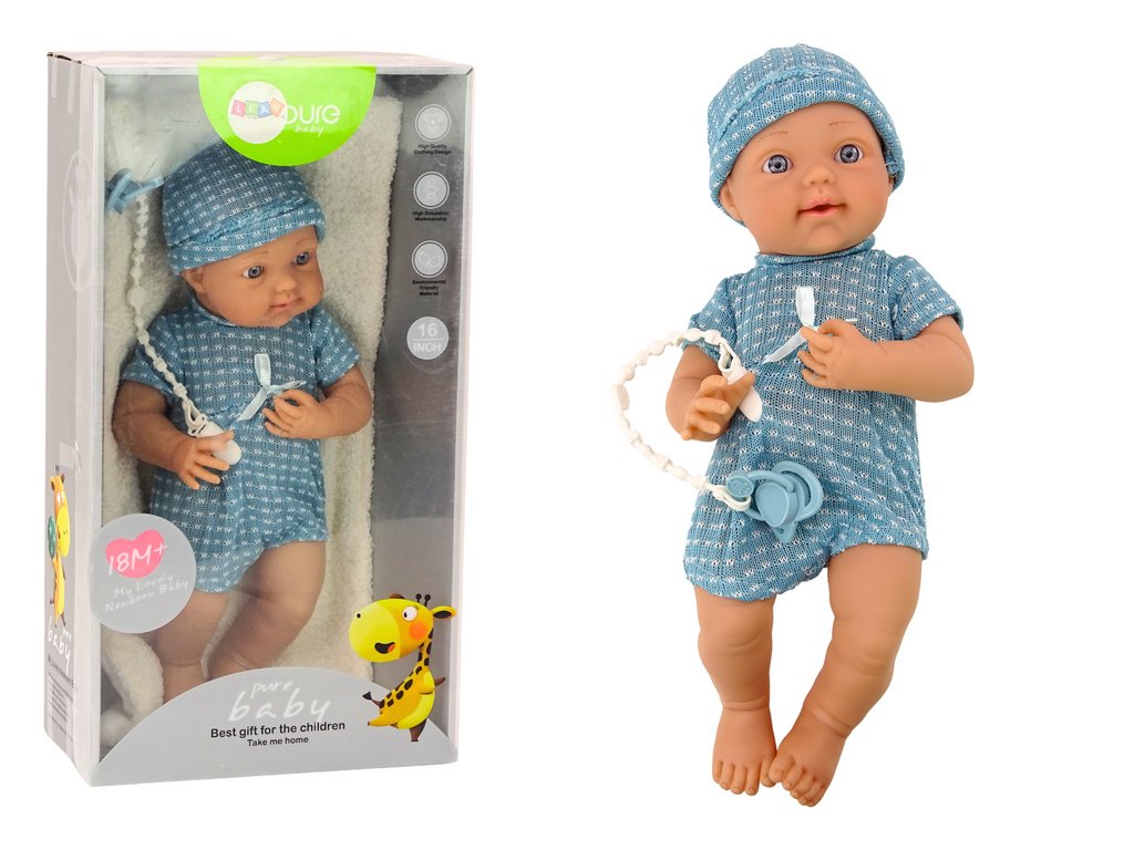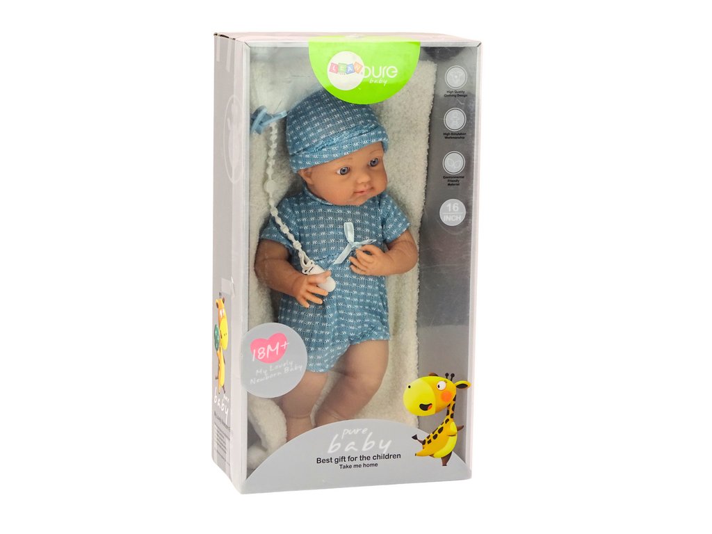 Кукла бебе с биберон и шапка синя е изработена от висококачествени и безопасни материали и притежава реалистични черти на лицето, които я правят да изглежда като истинско бебе. Подвижните ръчички и крачета позволяват интерактивна игра, която развива фината моторика и творческите умения на детето.