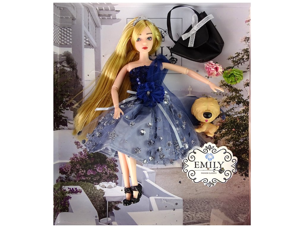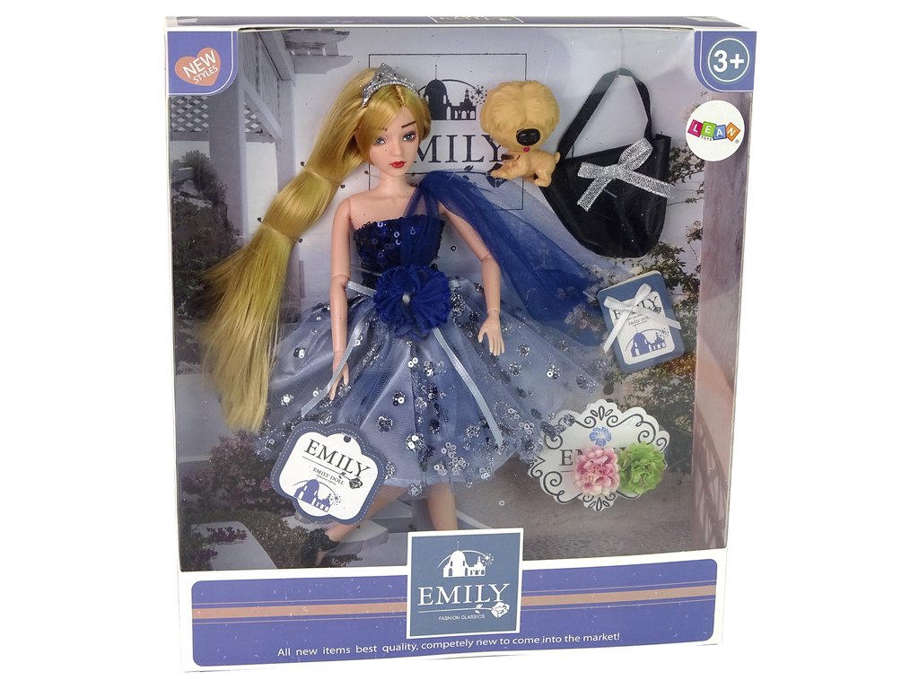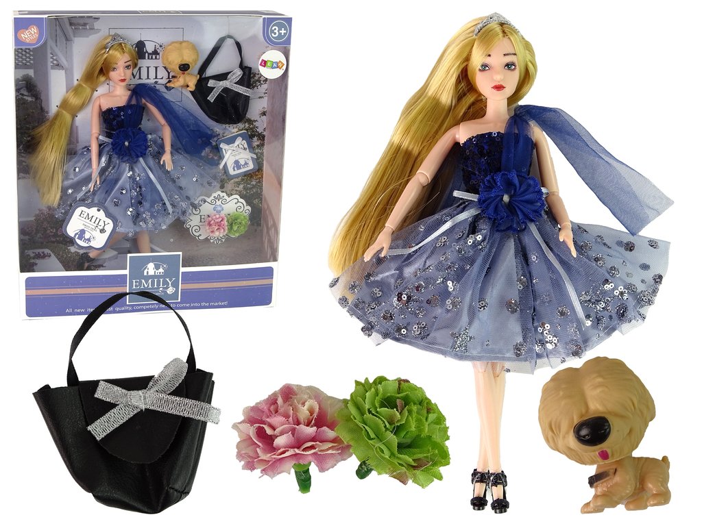 Представяме ви очарователната кукла Емили с кученце и аксесоари в удивителна тъмносиня рокля, украсена с блестящи пайети и елегантна панделка. Дългата ѝ руса коса е красиво допълнена с диадема, която ѝ придава неповторим чар. На краката си Емили носи стилни черни обувки на ток с деликатна розичка като декорация.