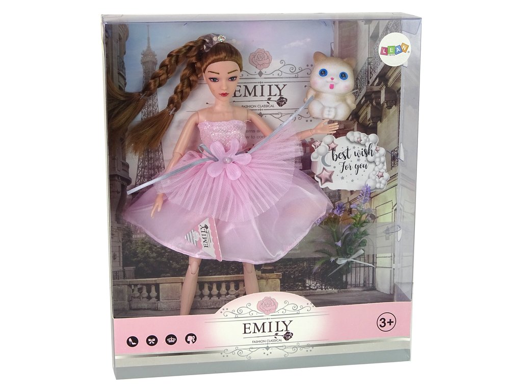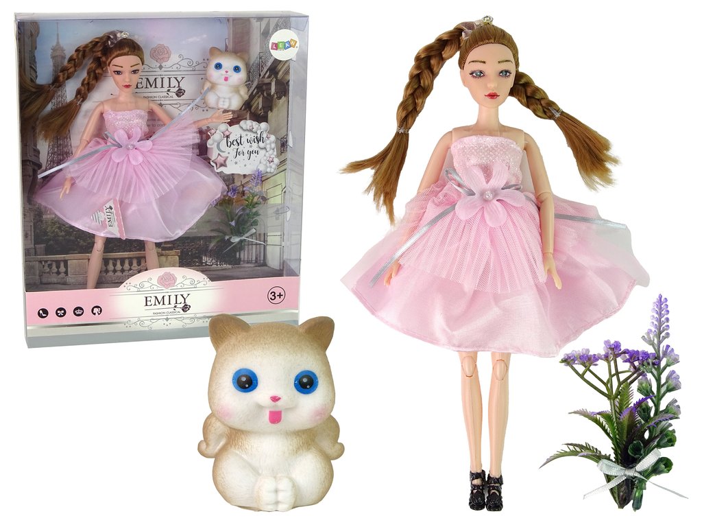 Представяме ви очарователната Кукла Емили с опашки и котка, с дълга коса, сплетена в две опашки, които канят към създаване на различни прически. Куклата е с красива украса за коса, която перфектно допълва стила ѝ.