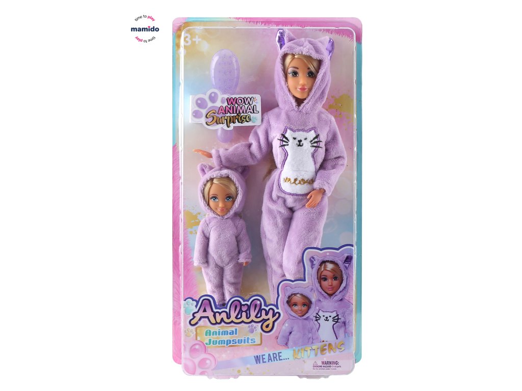 Сладката кукла Анили в комплект с малка кукла ще зарадва всички деца, които обичат креативните игри. И двете кукли са облечени в меки лилави гащеризони с качулка и ушички, напомнящи котка. Благодарение на детайлното изпълнение и мекия тоалет, играта с тях е не само забавна, но и стимулира въображението.
